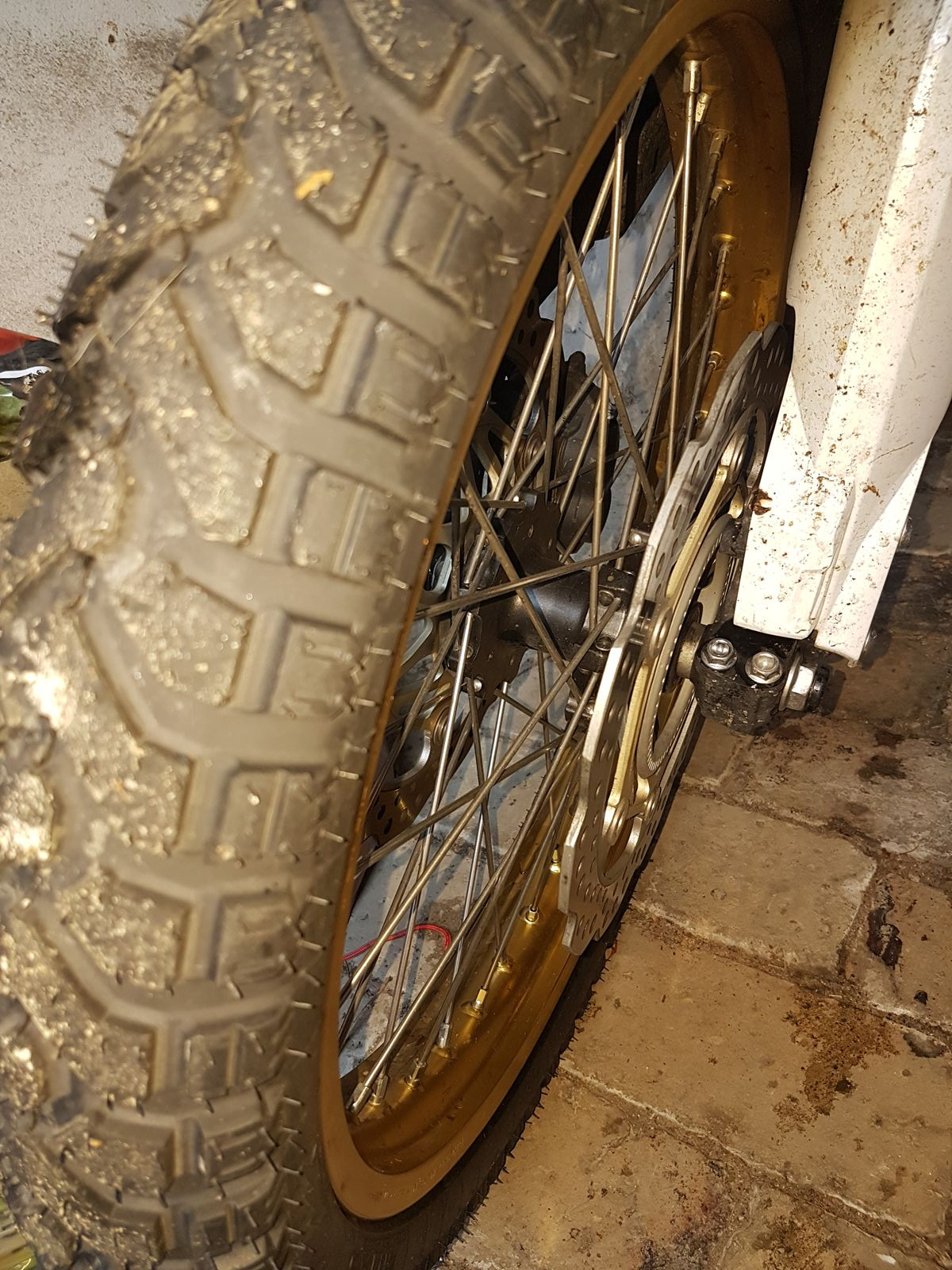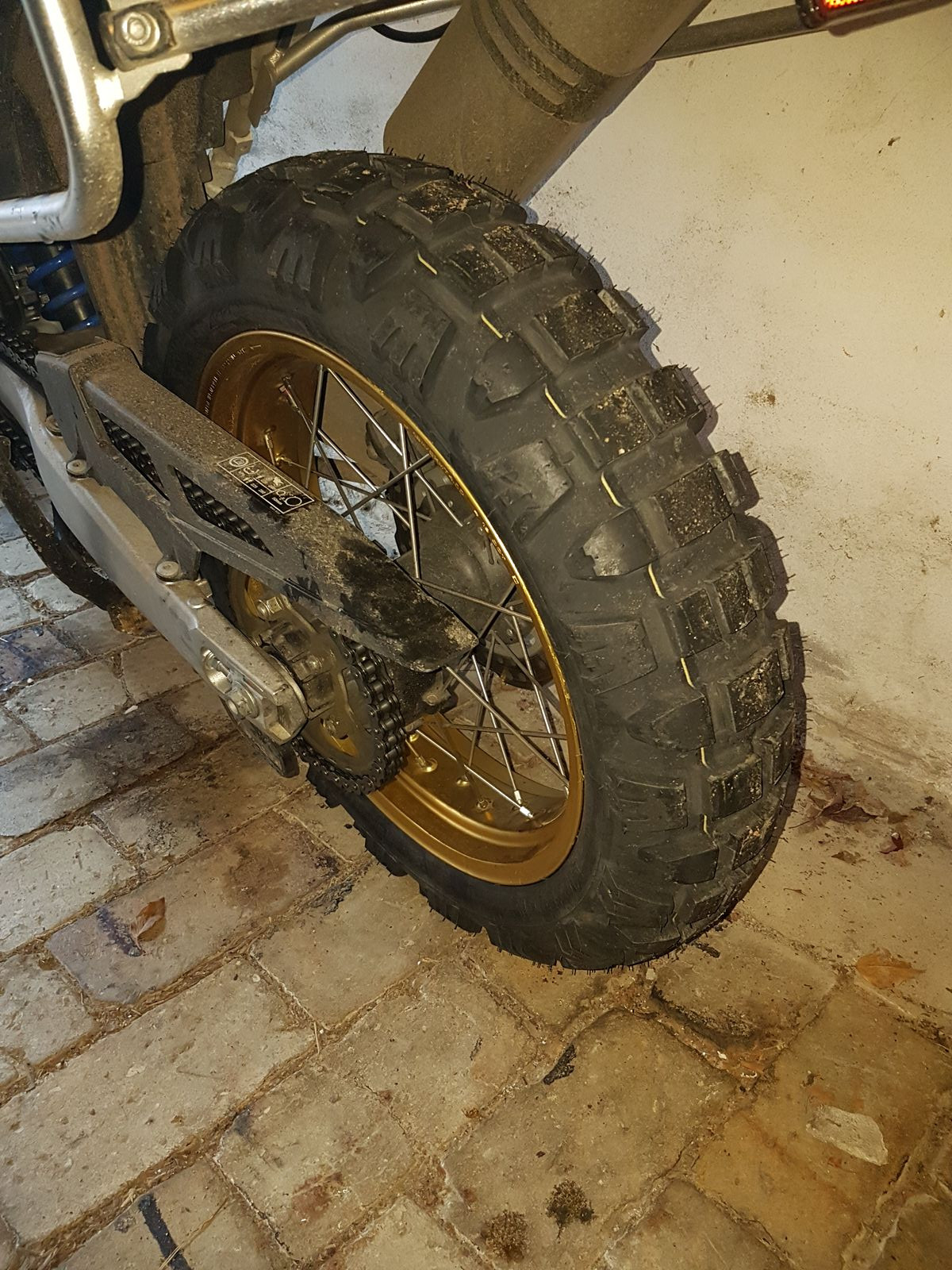 Hab jetzt vorne den Mitas E07 Plus drauf und hinten den E09 Dakar. Der 09 lag noch rum von der KTM 690er, die ja nach stolzen 300km die ich damit gefahren bin beim Händler steht und gerade komplett zerlegt wird!