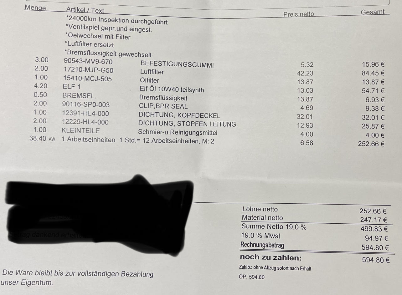 Mich wundert, das als Öl elf 10W-40 eingefüllt wurde, fa Honda ja 10W-30 empfiehlt, mit dem Zusatz JASO T903 oder mindestens die Qualität API - SG empfiehlt...