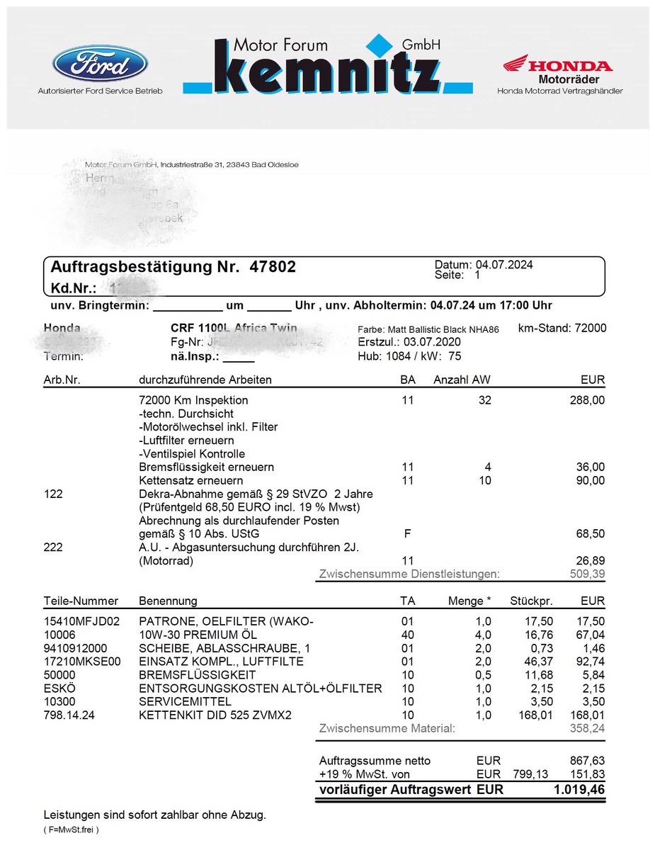 So, meine Dicke (SD08) ist ja zur 72er fällig. Für alle, die gerne eine Referenz hätten, stelle ich hier den KVA meines Freundlichen rein.