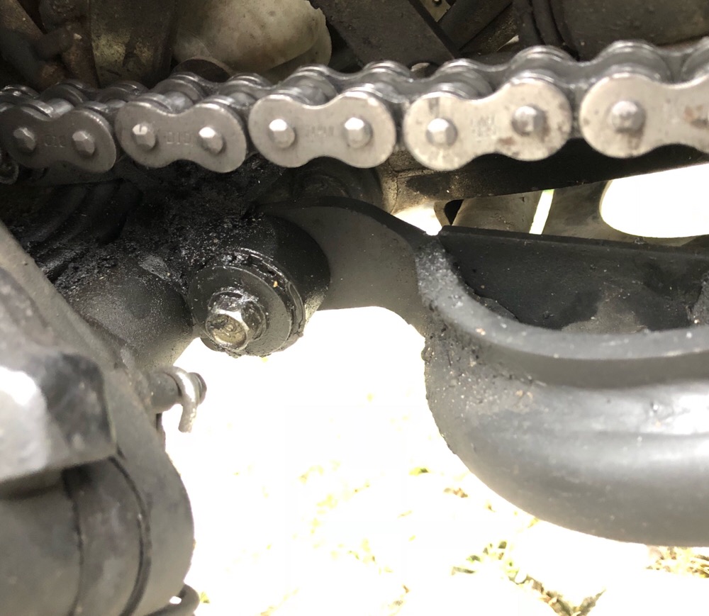 Bei Aufbocken der Maschine auf den Hauptständer habe ich mich gewundert, warum der Hauptständer plötzlich an der Außenseite der Kette schleift und der Hauptständer beim Abbocken mit dem Rohrgestell an die Schwinge schlägt.