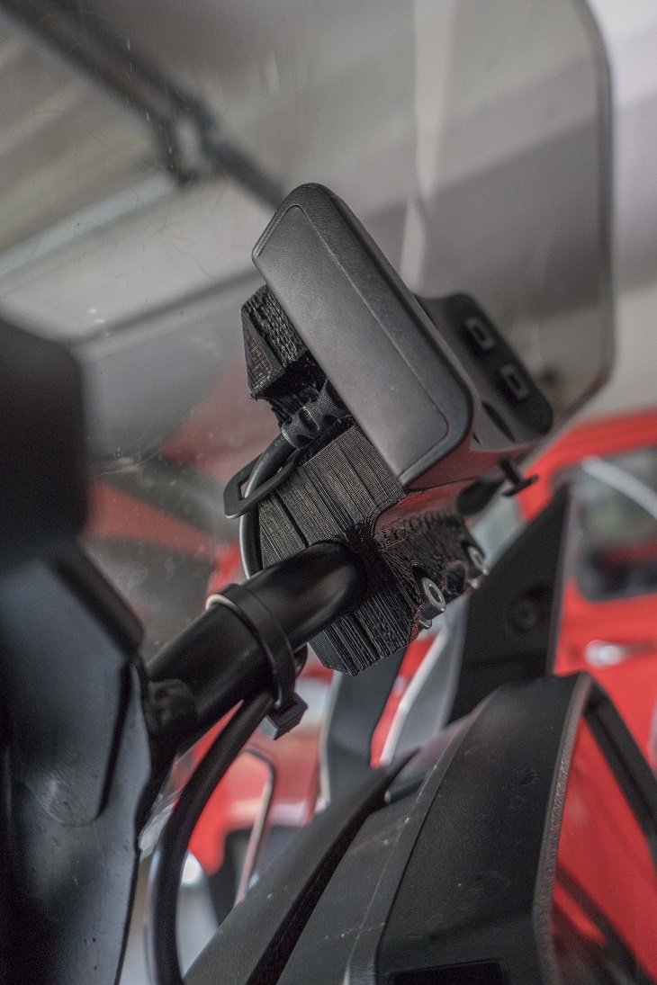Auf dem Bild sieht die 3D Druckqualität weitaus schrecklicher aus als sie es tatsächlich ist. Version 1.1 steht schon in den Startlöchern. Diese Halterung funktioniert schon sehr gut und hält bombenfest. Es vibriert und verrutscht nichts. Auf dem Bild im montierten Zustand sieht man ein Grund warum es Version 1.1 geben wird. Die Kabeldurchführung sitzt nicht ganz zentrisch vom Kabel. Es ist zwar ausreichend Platz um das Kabel aber der Ehrgeiz will es zentrisch.