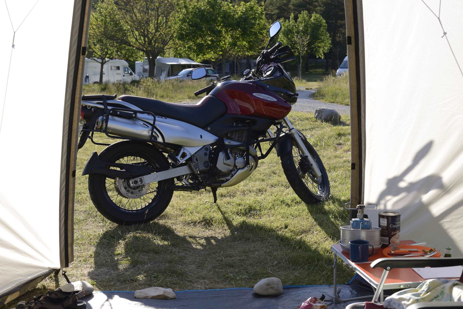 Es ist für den Transport auf dem Motorrad ziemlich voluminös (auf dem Foto die kleinere Rolle auf dem Soziusplatz) und mit 10,5 kg auch nicht leicht. Allerdings habe ich das sogar auf einer relativ "kleinen" Suzuki Freewind geschafft zu transportieren. Ist das Ding am Zielort aufgebaut kann der Luxusurlaub richtig losgehen - für alles gibt es Platz genug. Der Aufbau ist dank Bogenkonstruktion auch für eine Einzelperson ohne Hilfe einfach. Es sei denn, es stürmt! Der grüne Stapelstuhl ist übrigens eine "Leihgabe" vom Campingplatz - Tisch und Klappstuhl hatte ich aber dabei.