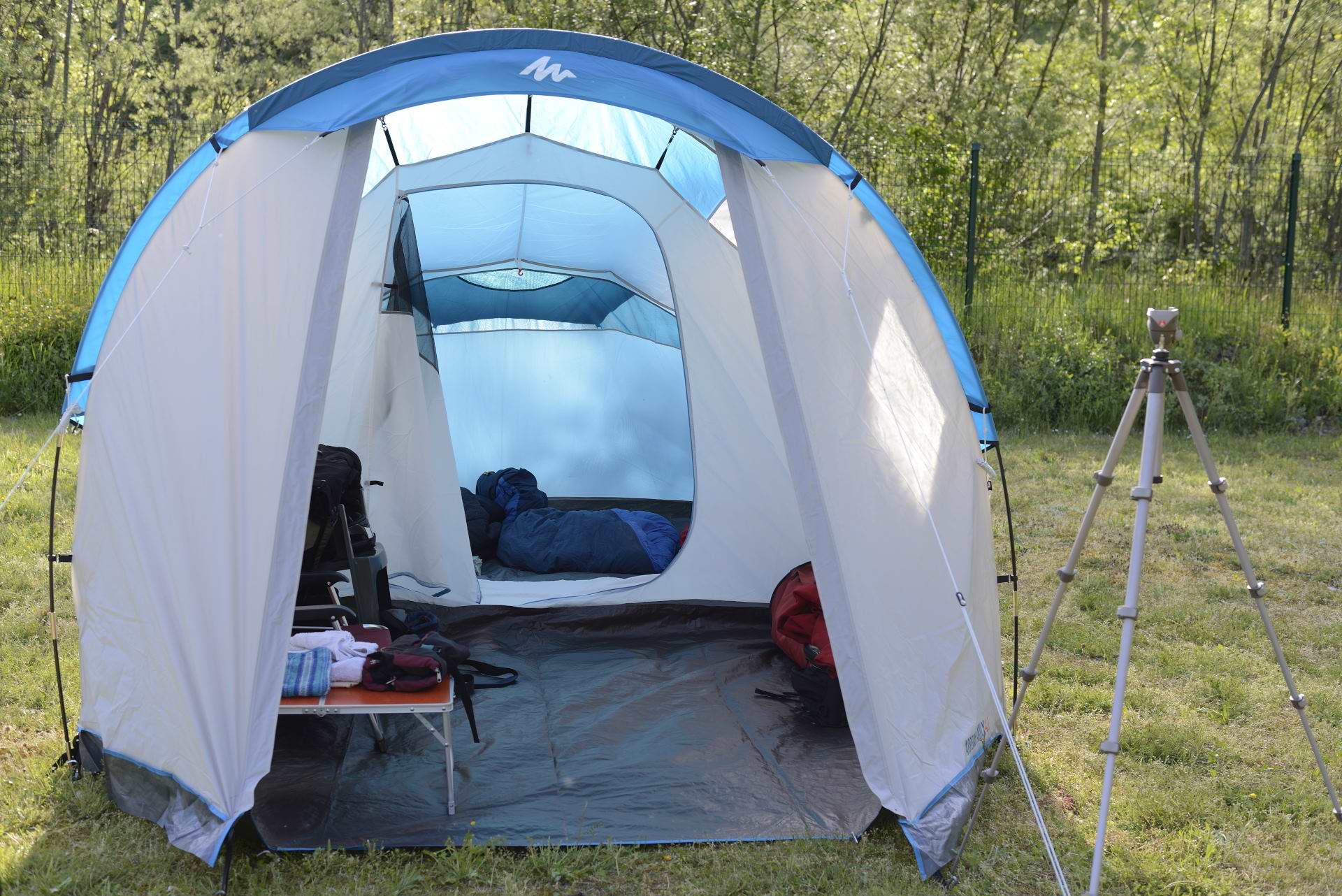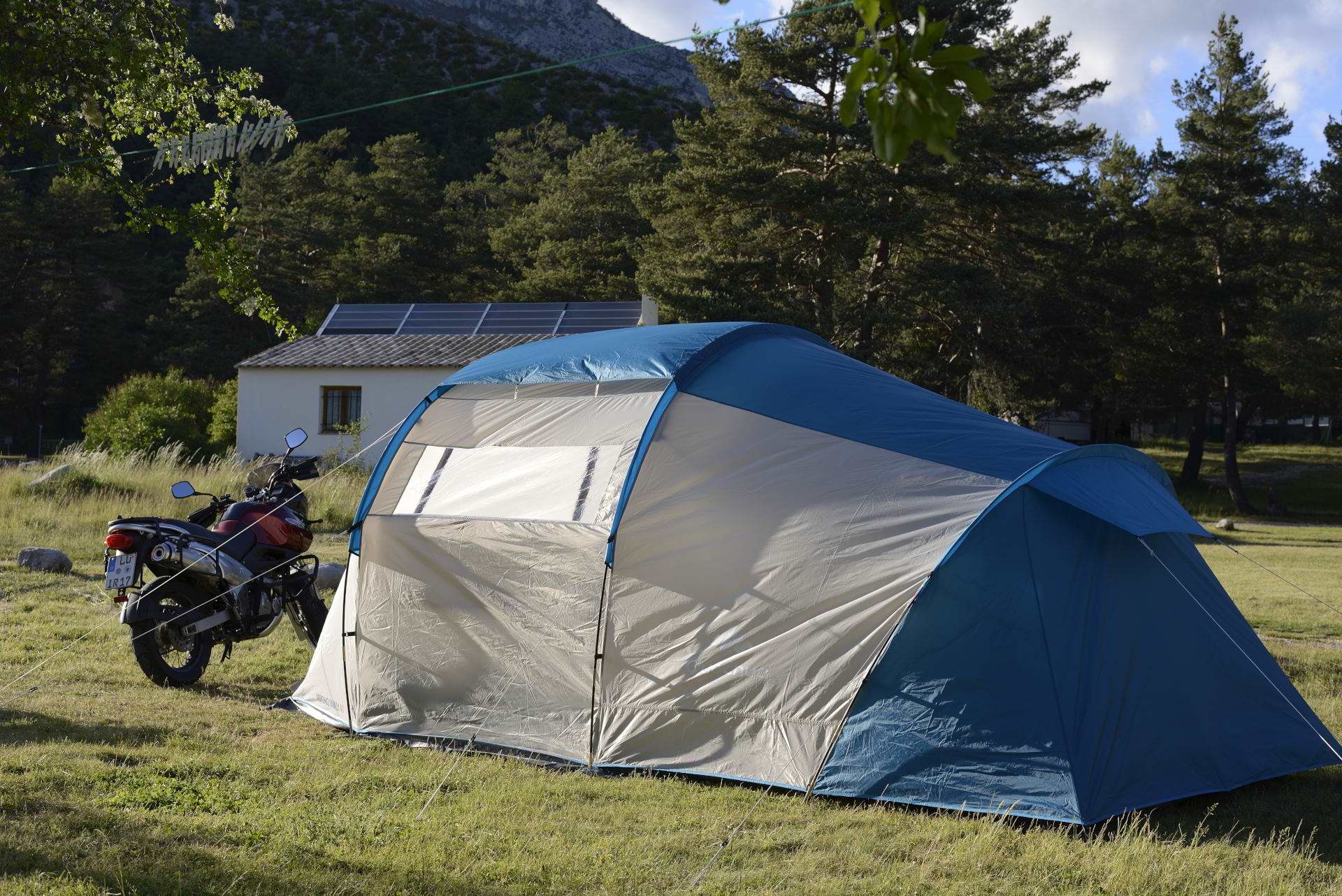 Inzwischen bin ich in die Jahre gekommen und bequemer geworden. Feste Herbergen sind aber gerade in Frankreich wesentlich teurer als ein Campingplatz. Deshalb habe ich mich darauf spezialisiert ein landschaftlich reizvolles Ziel anzusteuern und dort für etwa zwei Wochen zu campen, deshalb ist hier ein großes, komfortables Zelt geeigneter. Ich möchte nicht während einer Schlechtwetterperiode mehrere Tage auf dem Bauch herumrutschen müssen! Meiner inzwischen sehr umfangreichen Zeltsammlung habe ich 2016 für 99 € ein Decathlon Arpenaz 4.1 Family hinzugefügt, welches sich auf meinem Platz im Grand Canyon du Verdon bei jedem Wetter als sehr geeignet erwiesen hat.