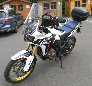 Africa Twin CRF1000, Schaltgetriebe, Honda-Hauptständer, Steckdose, Gepäckbrücke, Motor - und Tankschutzbügel von H&B, Kotflügelverlängerung