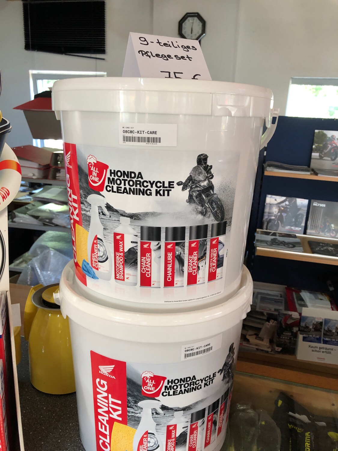 bei Honda gibt momentan so ein Putzset mit Eimer. Kostet 75€. Ist zwar teuer im Vergleich zu den Einzelteilen, aber für HONDA Fans und Sammler evtl. Wert.