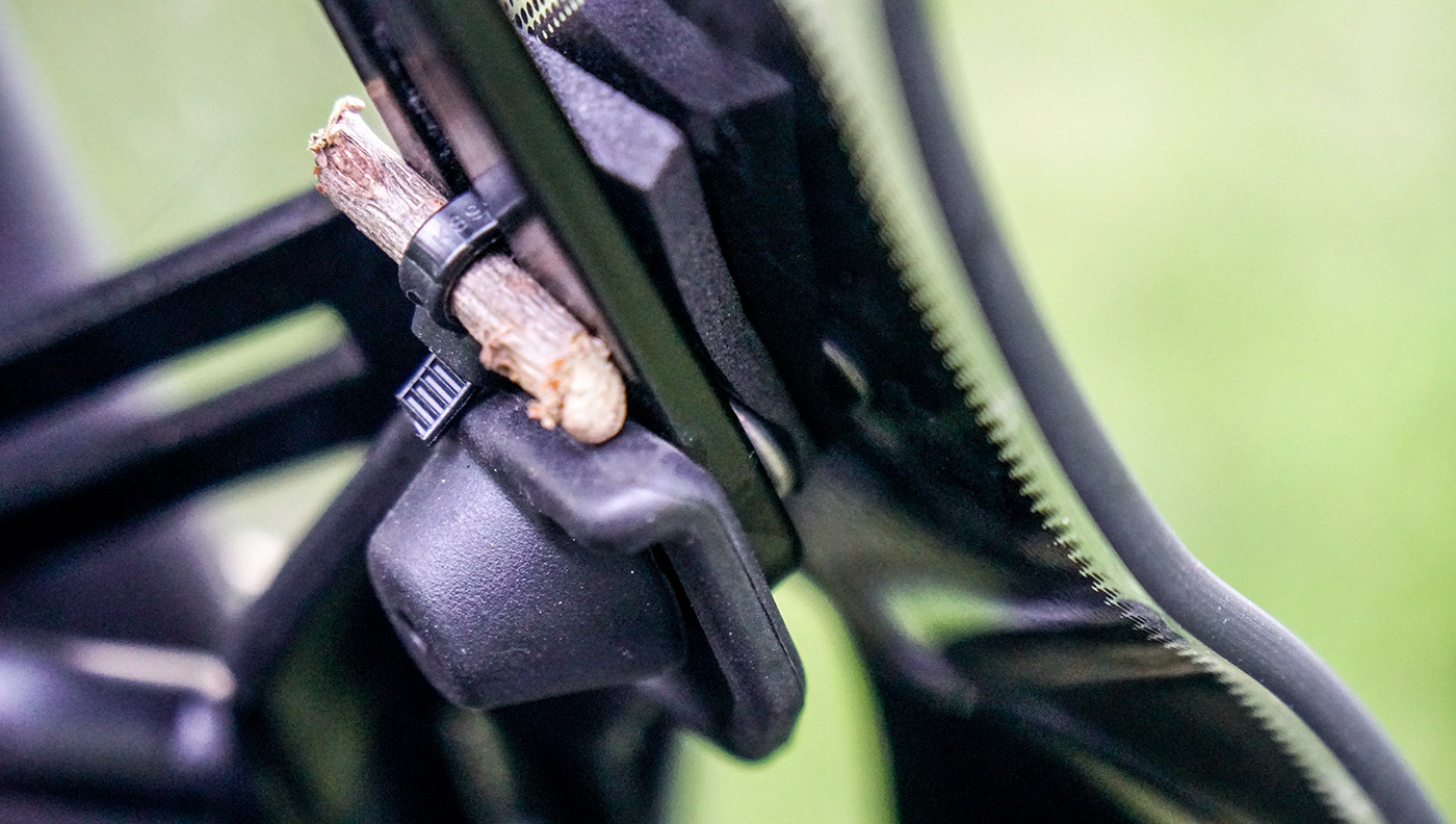 Auf meiner Schütteltour ging mir gestern eine Schraube des Batzen-Verstellers flöten, d. h. die liegt irgendwo im Graben, und die Scheibe fing plötzlich bedrohlich an zu wackeln. Zum Glück habe ich Kabelbinder, etwas Moosgummi (für Schuhpolster) und ein Sackmesser dabei. Na ja, mit Verstellen ist natürlich vorerst nix.