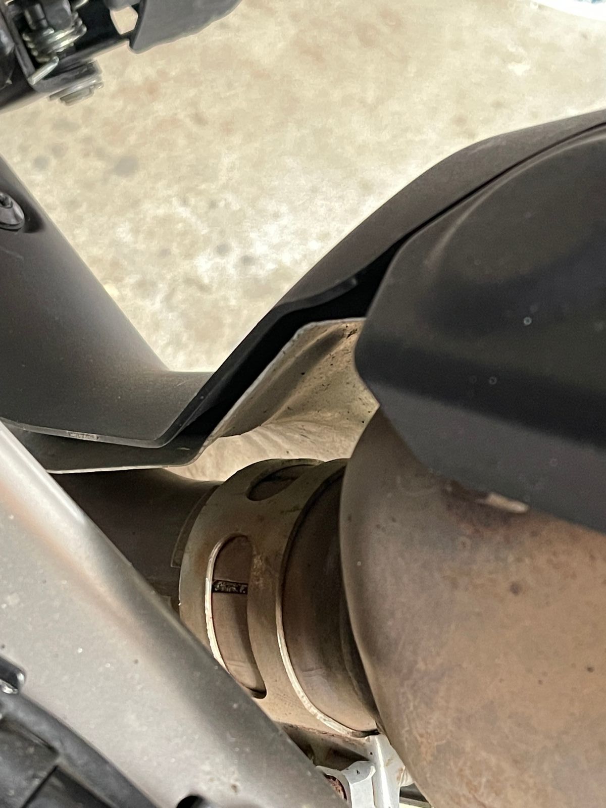 Die Seite am Rad ist am schlimmsten betroffen. Da ist sogar die Schweißnaht rostig. Oben auf dem Schalldämpfer sind aber auch schon Rostpickel.