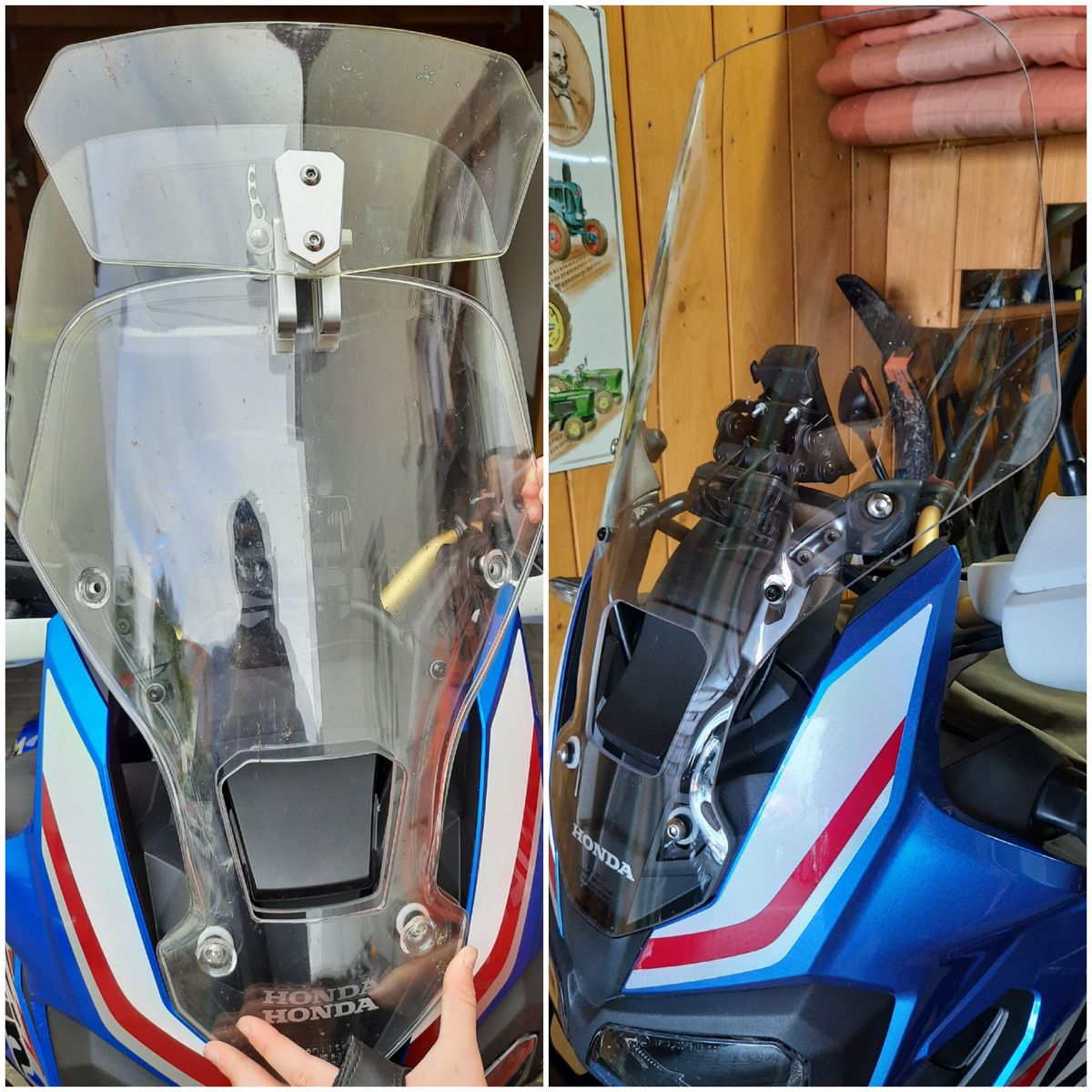 Über den Umweg der hohen Puig Tourenscheibe (schlechter als Spoiler - Scheiben Konstrukt) hatte ich günstig die Gelegenheit die Orginal ATAS (hohe Scheibe) zu erwerben. Die bis jetzt beste auch optische Lösung. Sie ist etwa 1,5 cm kürzer als mein Konstrukt mit China Ausatz ( siehe Bild).