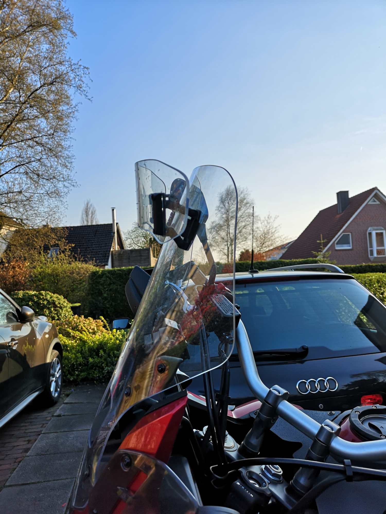 Der Spoiler soll aber den Luftstrom nach oben verbreitern und 'weicher' machen. Die Höhe der oberen Scheibenkante ist nicht so wichtig. Sollte meiner Meinung nach unterhalb bis deutlich unterhalb der unteren Visierkante deines Helmes liegen.