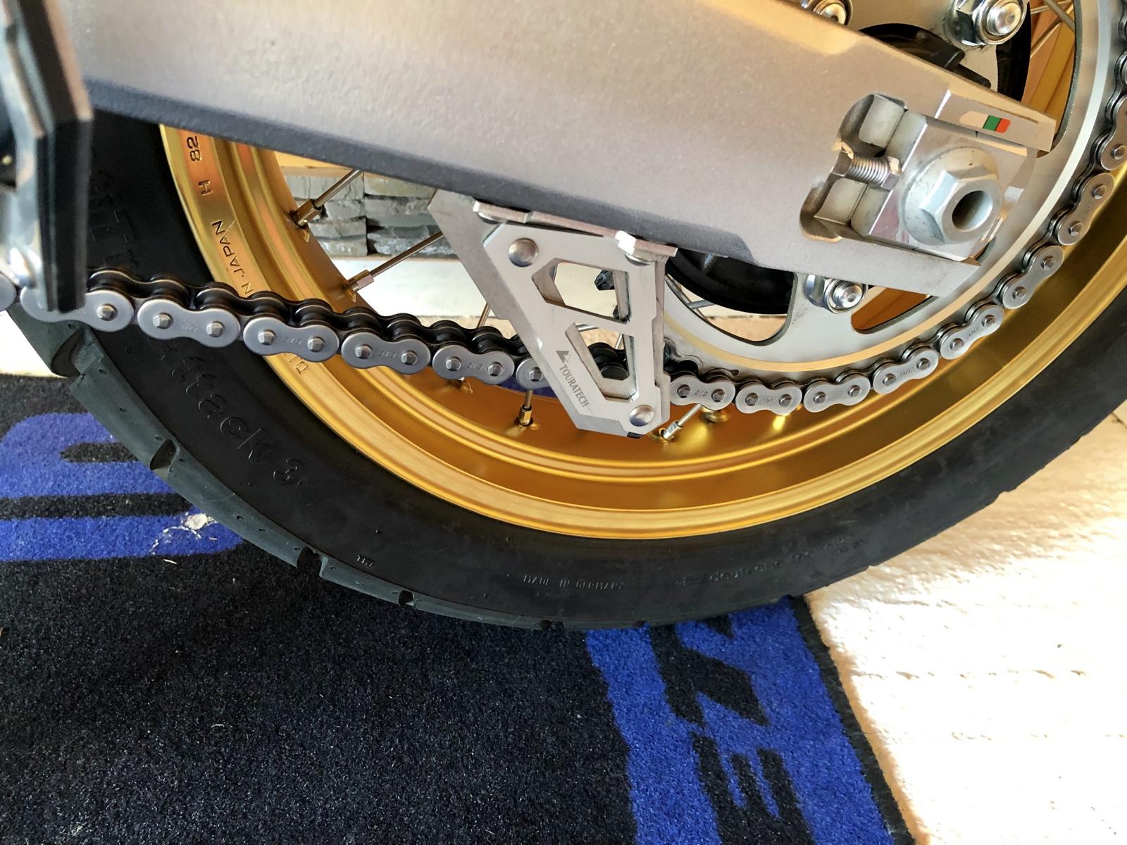 Anbei Fotos, 1) zu der silbernen Masse an Hauptständer und Kette und 2) meine Felge