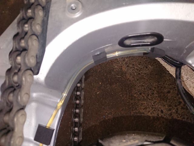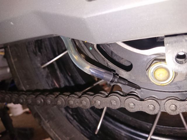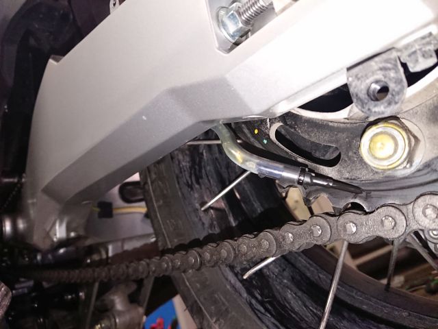 Ich habe die Duese bei der AT jetzt innen an der Kettenfinne (dem Ding unter der Schwinge) festgeschraubt, da sitzt sie deutlich geschuetzter. -