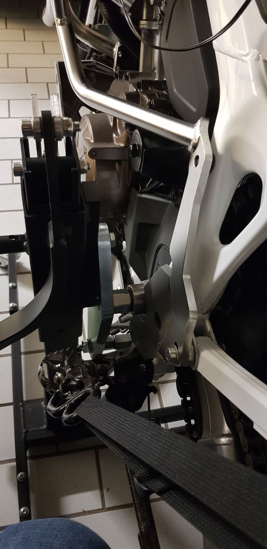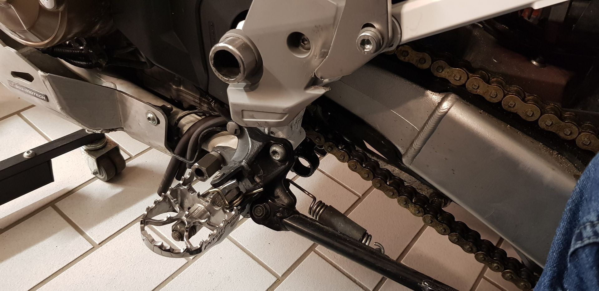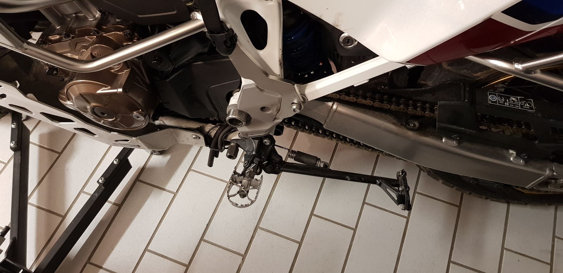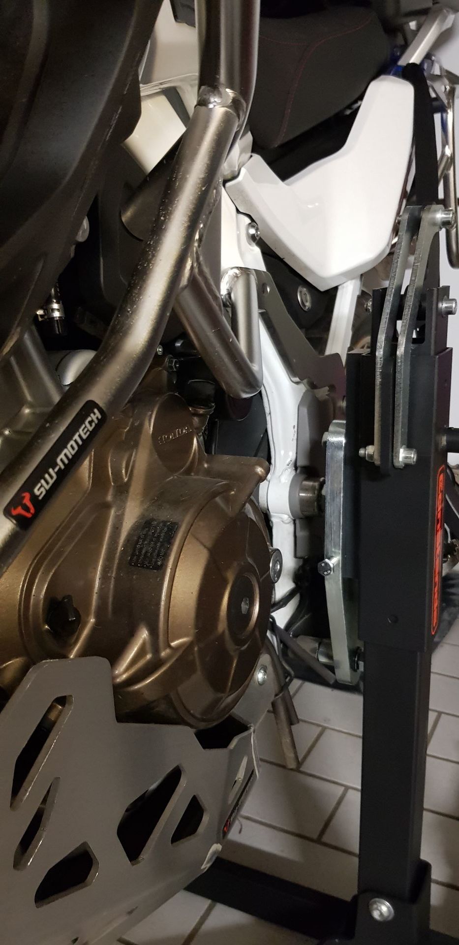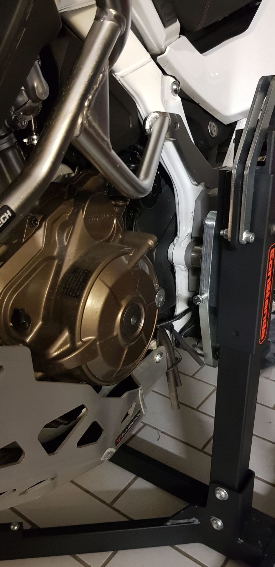 Zitat: "Wir hatten die AT in der Werkstatt. ... Die Aufnahmepunkte sind unzulänglich und die Maschine ist zu hoch. Aus den Gründen können wir keine Ständer bzw. Adapterplatten für die Africa Twin anbieten. Tut uns leid."