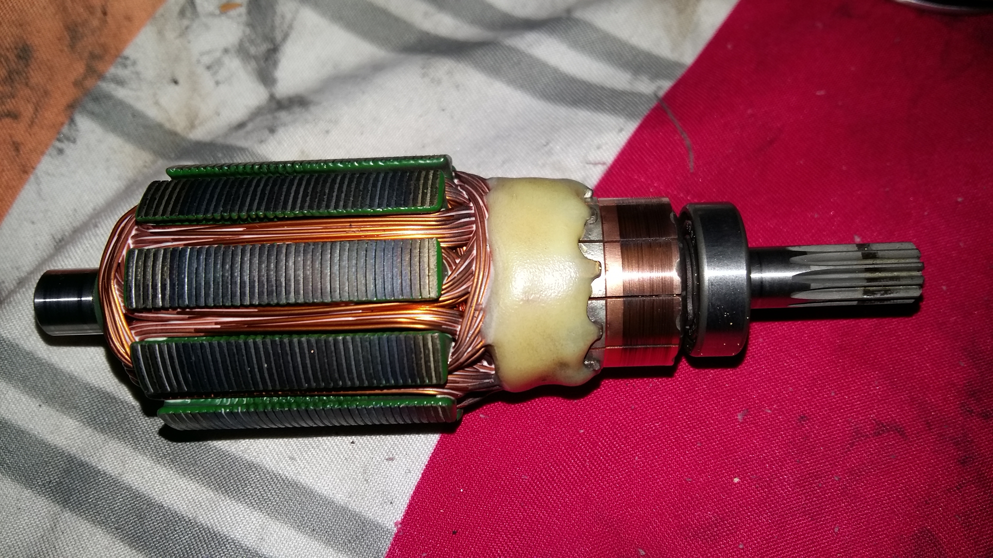 Kugellager, Ankerwicklungen, Kommutator, Bürste sind ok. Nur innen drin war ziemlich dreckig. Gereinigt, gefettet, zusammengebaut- wie neu.