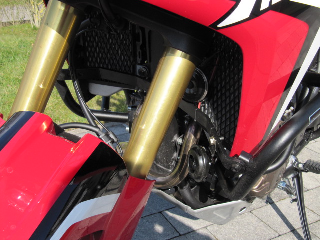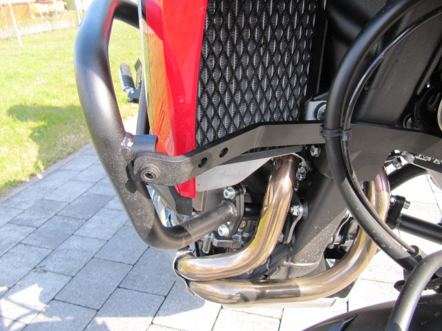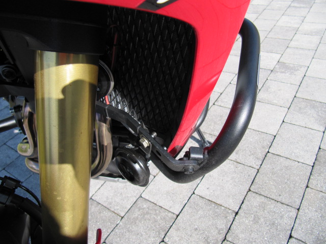 ja, ist mehr als grenzwertig ungenau auf der rechten Seite. Auch die Hupe steht der Querrstrebe im Weg, die hab ich aber gleichgebogen. Den rechten Fersenschutz wollte ich auch nicht anbohren und hab die ewig lange Schraube etwas gekürzt. Jetzt ist der Schutz ohne Bohrung dran. Macht aber im gesamten einen sehr stabilen Eindruck, im Vergleich zu den hohen Zierbügeltrittbrettanbietern, TT, AQ und HB.