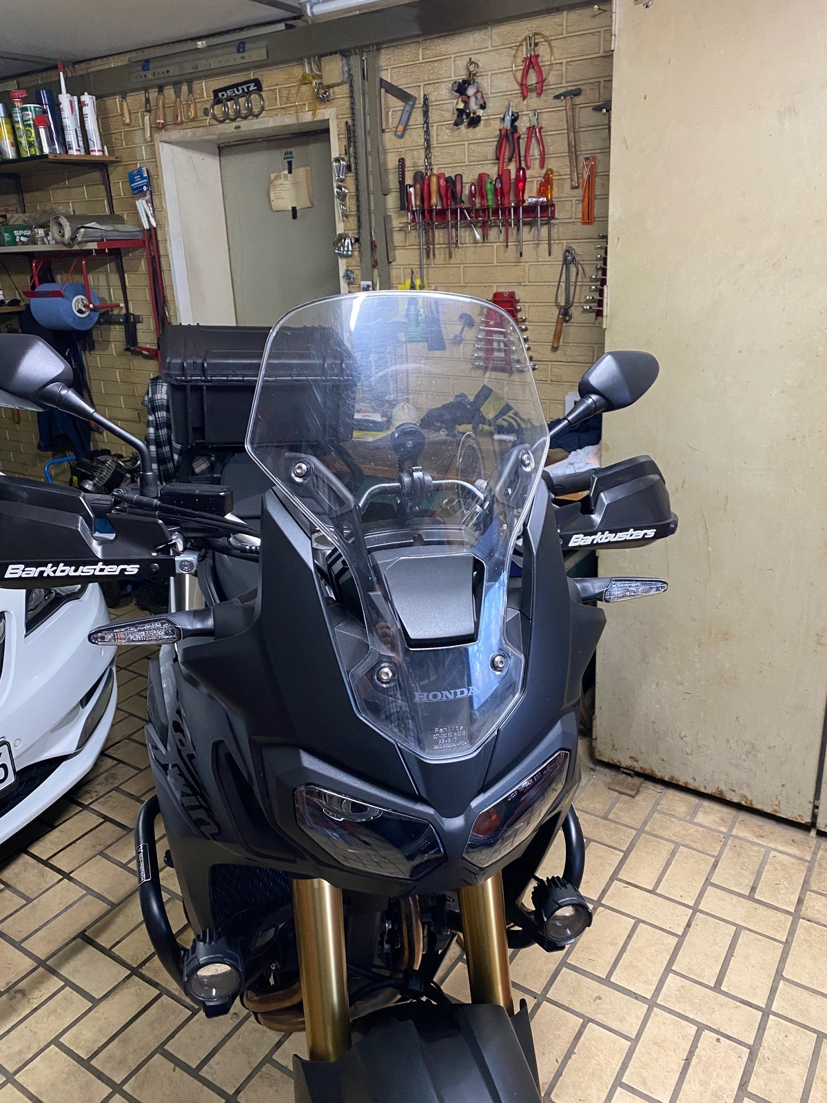 Heute habe ich mein vorgezogenes Eigenweihnachtsgeschenk montiert, einmal die MotoBozzo-Leuchten. War etwas fummelig, aber das war ja auch zu erwarten bei zwei Motorrädern in einer Garage von 1,90m Breite. Montage ansonsten super einfach an der SD08, hätte man sicher auch in gut 15 Minuten schaffen können.
