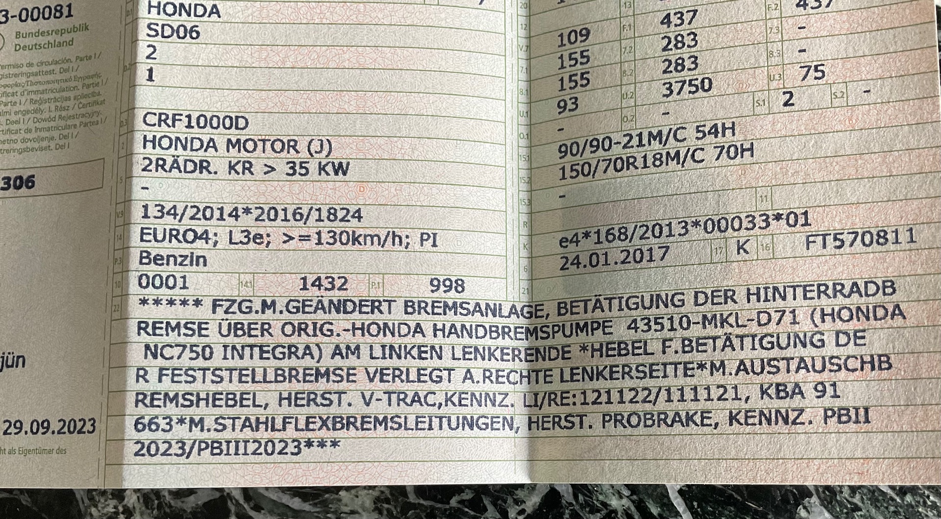 Fuß und linke Hand ist schwierig mit der Abnahme, da es ein Rückschlagventil braucht und das hat weder ABE, noch sonst eine Zulassung. Da ohne Fußbremshebel nur original Honda Teile zum Einsatz kommen, ist die Eintragung kein Problem.
