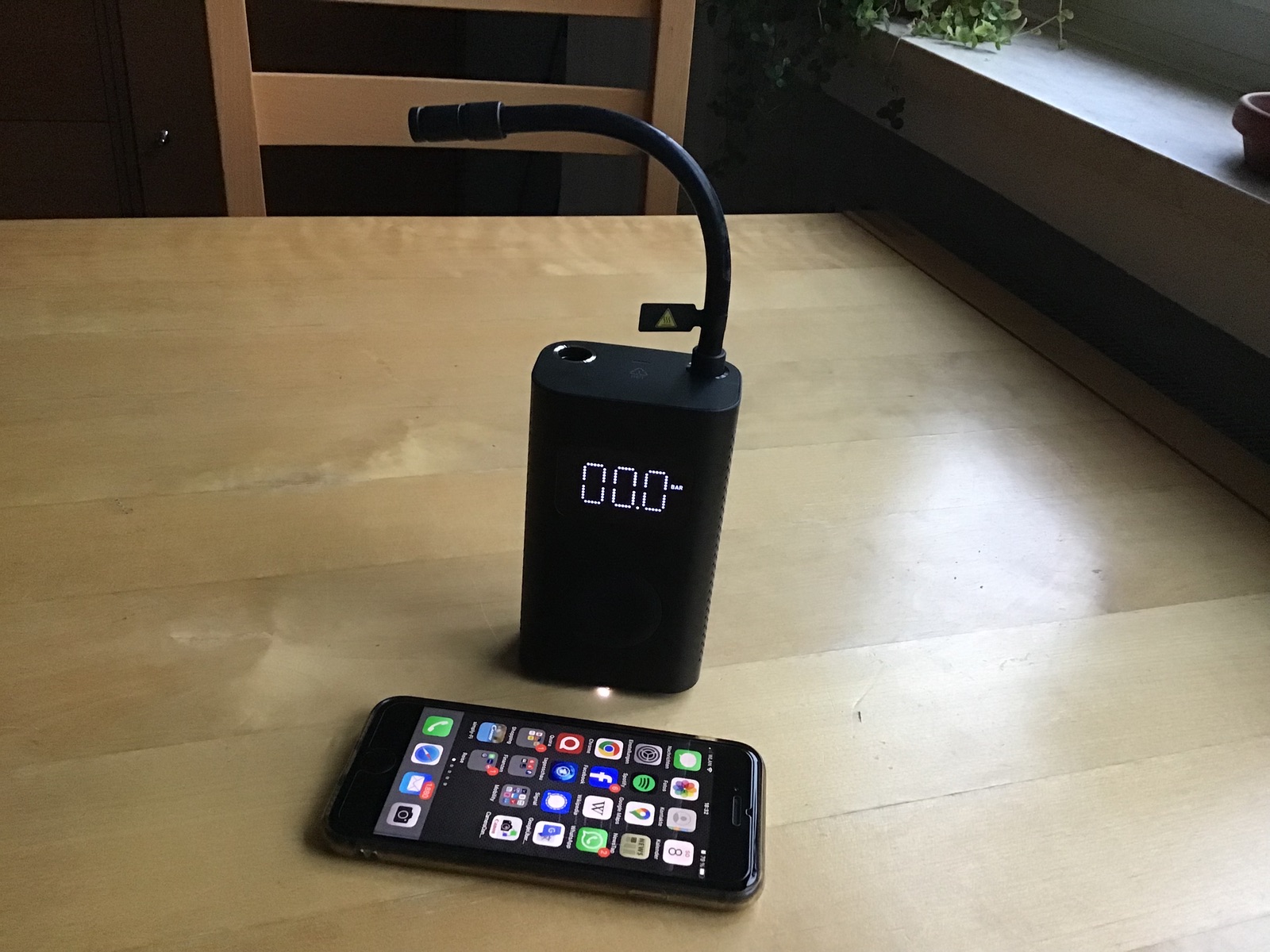 Das Ding schafft angeblich bis zu 10 bar. Man schraubt den Schlauch auf das Ventil, dann kann man sehen, wie viel Druck auf dem Reifen ist, dann stellt man den Wunschdruck ein und drückt auf Start. Mein Hinterreifen war auf 2,4 bar und sollte auf 2,8 bar, dafür orgelte das Ding rund 20 Sekunden. Von der Performance her vergleichbar mit dem bekannten 12V-Kompressor Airman, eventuell minimal leiser und halt ohne Schnur. Wiegt knapp ein halbes Kilo. Dabei sind ein Adapter für Fahrradventile und ein Nadelventil für Fußbälle.