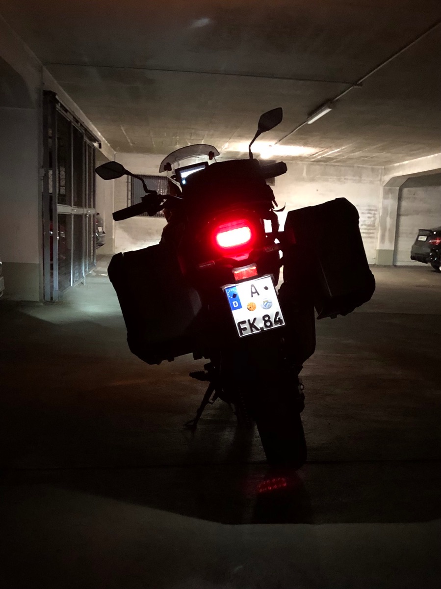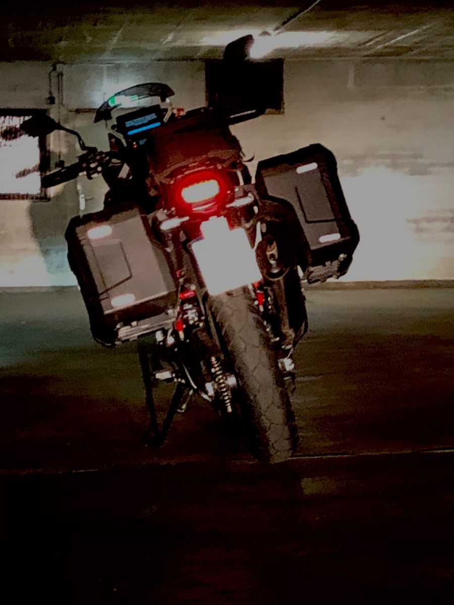 Und damit mein dezent lackiertes Kraftrad auch bei nächtlichen Ritten in der dunklen Jahreszeit anderen Verkehrsteilnehmern in seinen gesamten Dimensionen ins Auge sticht, habe ich einen Bogen Aufkleber von B Reflective gekauft und davon ein paar auf meine Koffer geklebt. Bei Tage sieht man sie kaum: