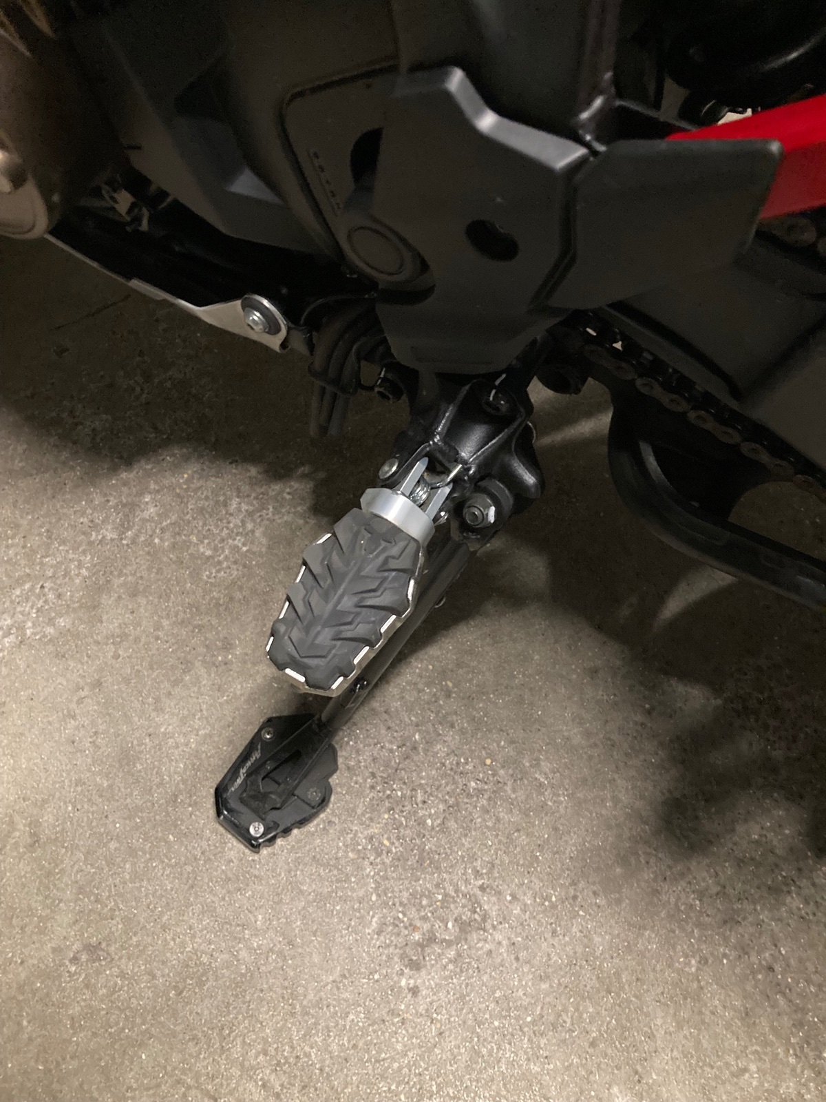 Ein paar tiefergelegte SW-Motech Evo-Rasten, zum Sonderpreis geschossen von einem Forumskollegen. Die sind zwar nur 15 mm tiefer, aber ich merke es deutlich am Kniewinkel. Zum Fahren bin ich noch nicht gekommen, aber eine erste Sitzprobe hat sich schon mal vielversprechend angefühlt. So etwa sitzen glaube ich normale 1,80-Meter-Typen auf einer Supermoto;-)