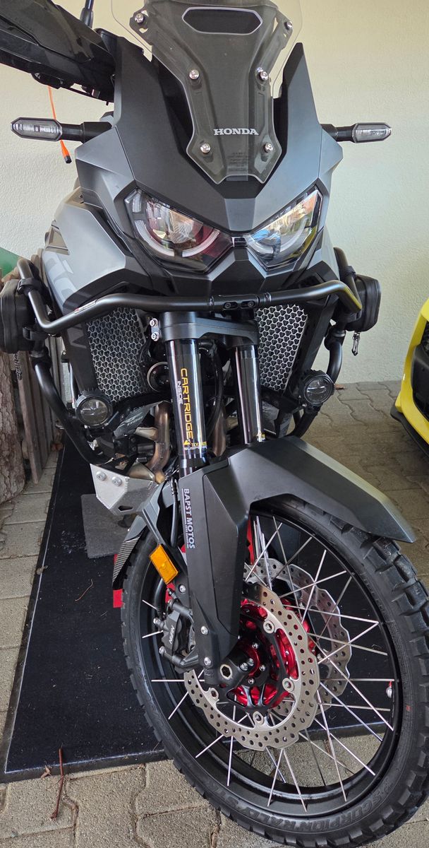 Dazu kommen die Rally Fußrasten, Sozius Komfort Fußrasten, Tankschutzs Pads transparent, Hauptständer, Kühlerschutz.