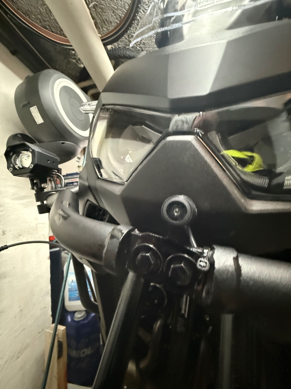 Ich habe den Sturzbügel von Outback Motortek montiert, da geht es sich leider nicht aus die Cam in der Mitte zwischen Bügel und Maske zu montieren und unterhalb des Bügels möchte ich sie eher nicht montieren (wäre doof wenn der Kotflügel in der Kamera einschlägt falls die Gabel mal komplett eintaucht).