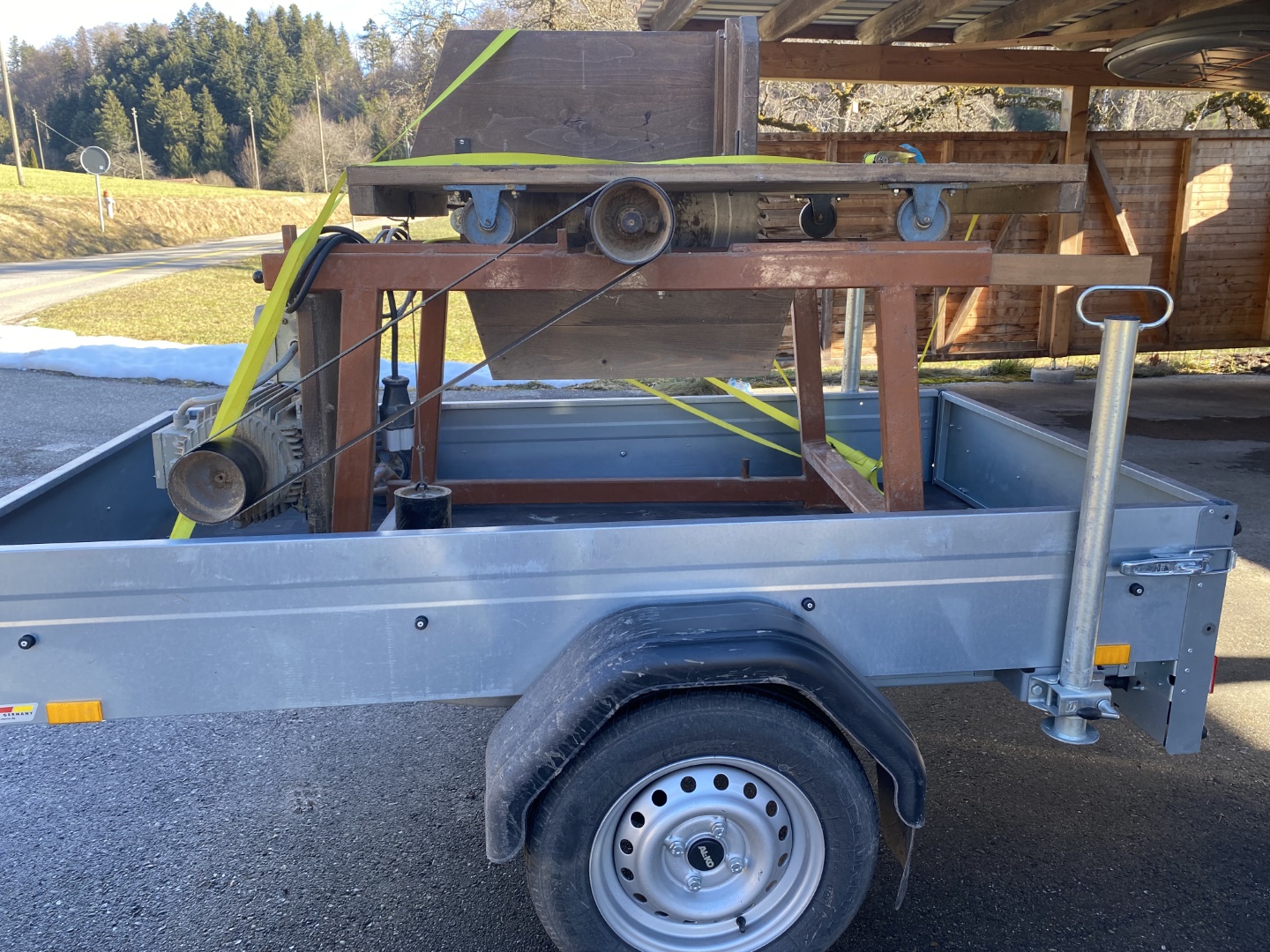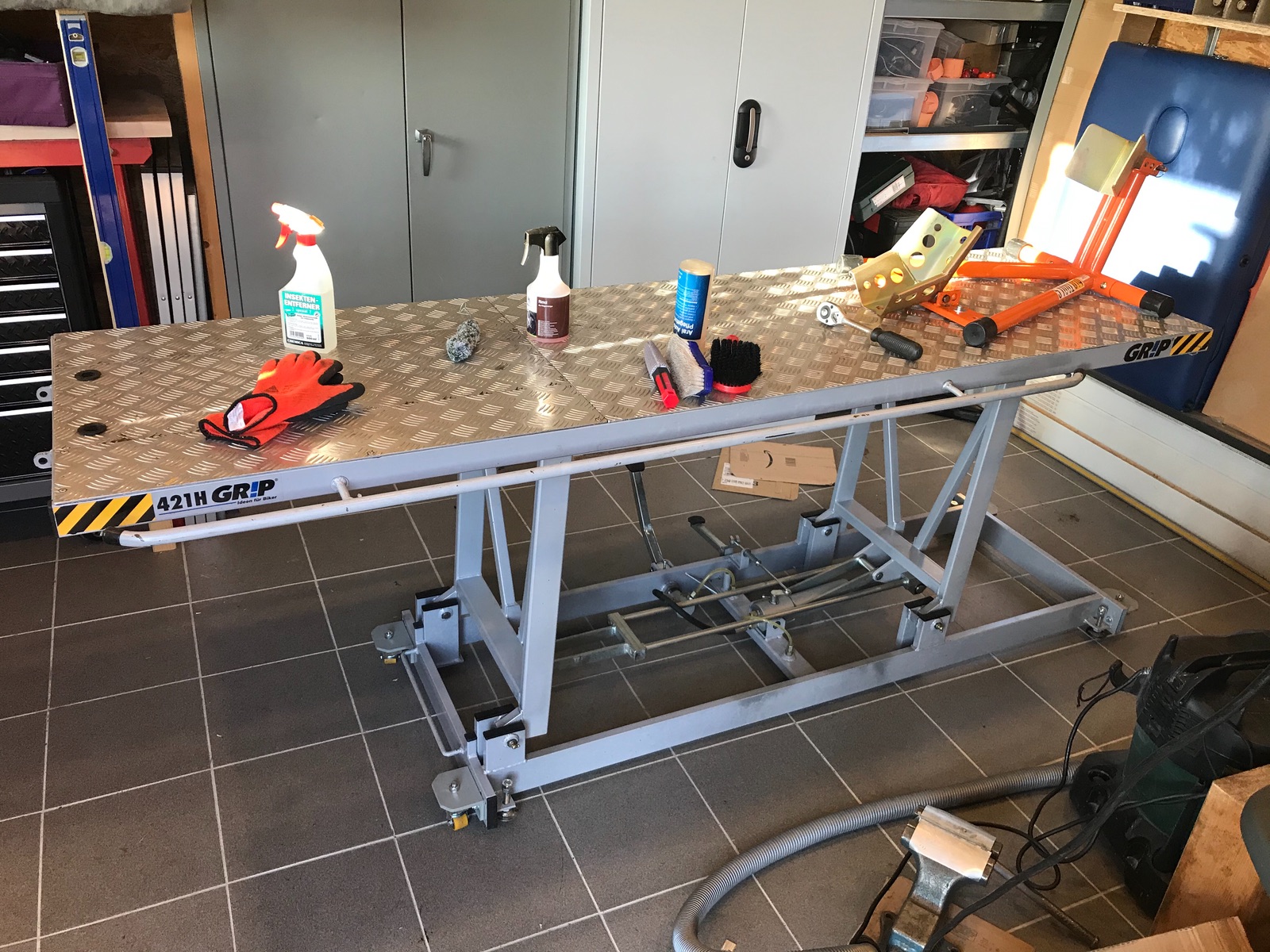 Zu guter letzt noch eine 20 Jahre alte Hebebühne. Habe mir Rollen unter gebaut damit sie besser verfahrbar ist bei Nichtgebrauch.