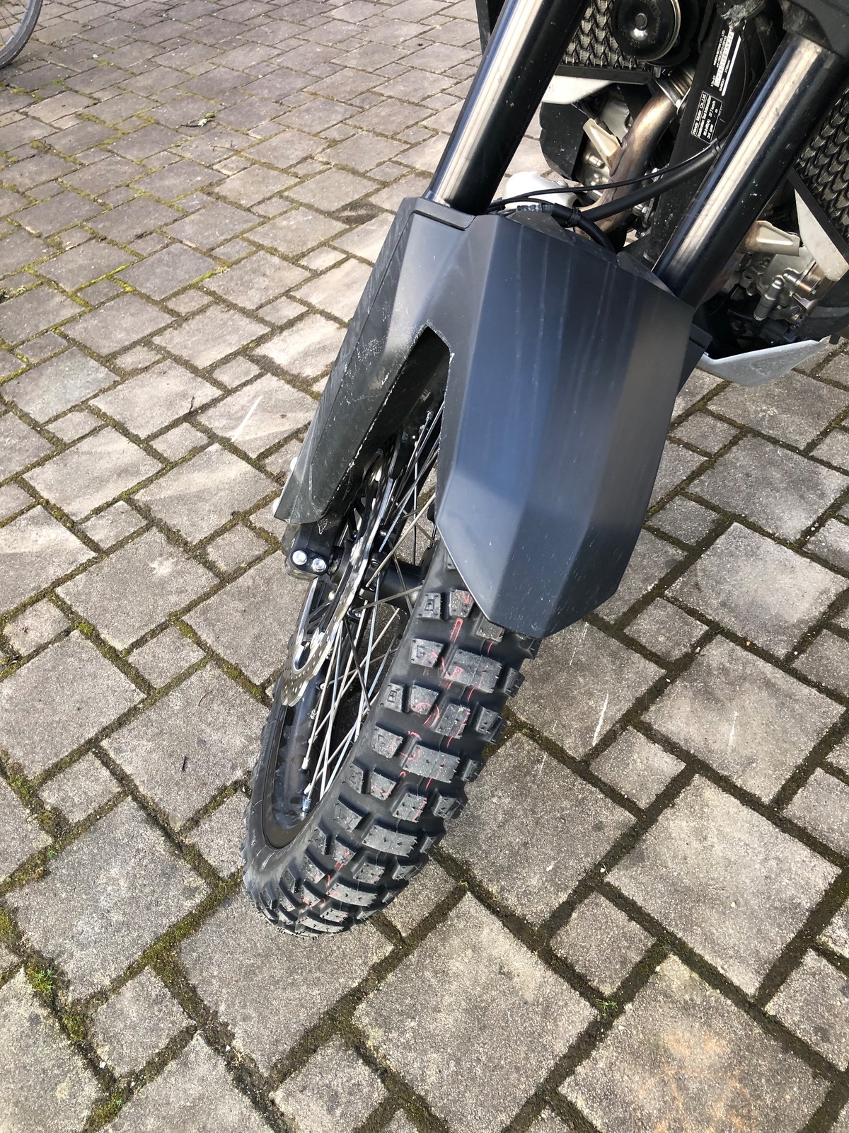Als der Reifenschrauber diesen aufzog, erschrak ich zunächst ob seiner Grobstolligkeit. Aber ich bin gerade mal 50 km gefahren, geht eigentlich. Mein Plan ist, damit so lange zu fahren, bis der Hinterreifen auch fertig ist, und dann kommt ein komplett anderer Satz drauf.