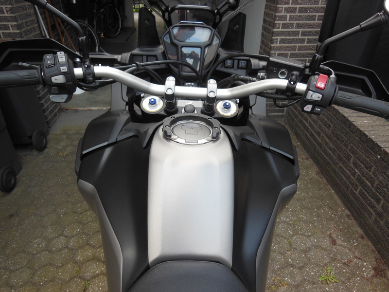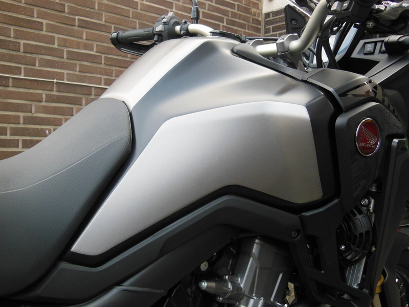 Zum Schutz des Lacks und zur "optischen Auflockerung" habe ich den Tank teilfolieren lassen. Der Farbton entspricht ziemlich genau dem silbergrau des Originalschriftzuges. Auf den Fotos wirkt er durch Reflexionen heller als im original.