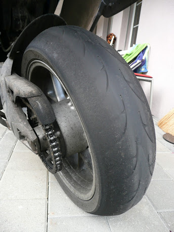 So sah der Reifen meiner Ex-Tiger 1050 mal nach einer 5-tägigen Hochalpentour mit Sozia aus. Da bin ich die letzten 400km sehr sorgfältig gefahren. Als wir zu Hause losgefahren sind, war der ganz neu: