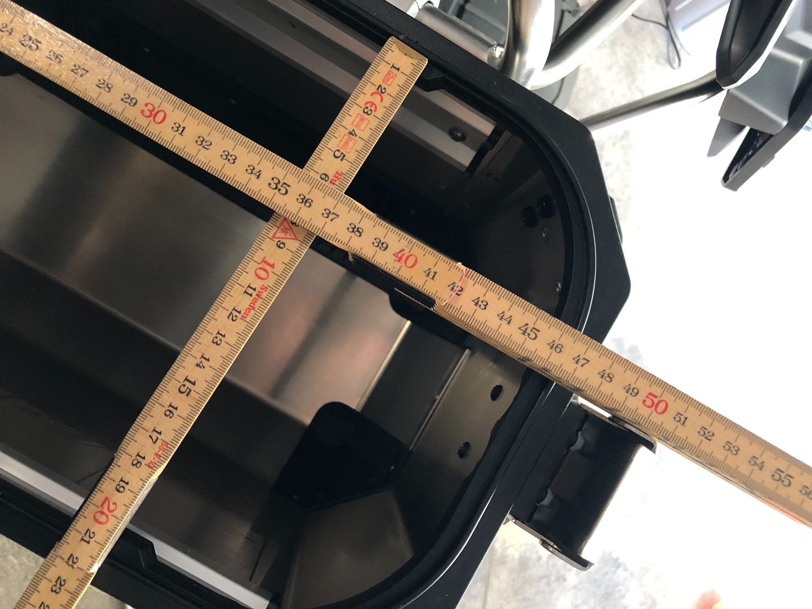 Dies ist das Top Case, breit etwa 370 und längs etwa 360, die Höhe ist 230 + 70 Deckel (= total 300)