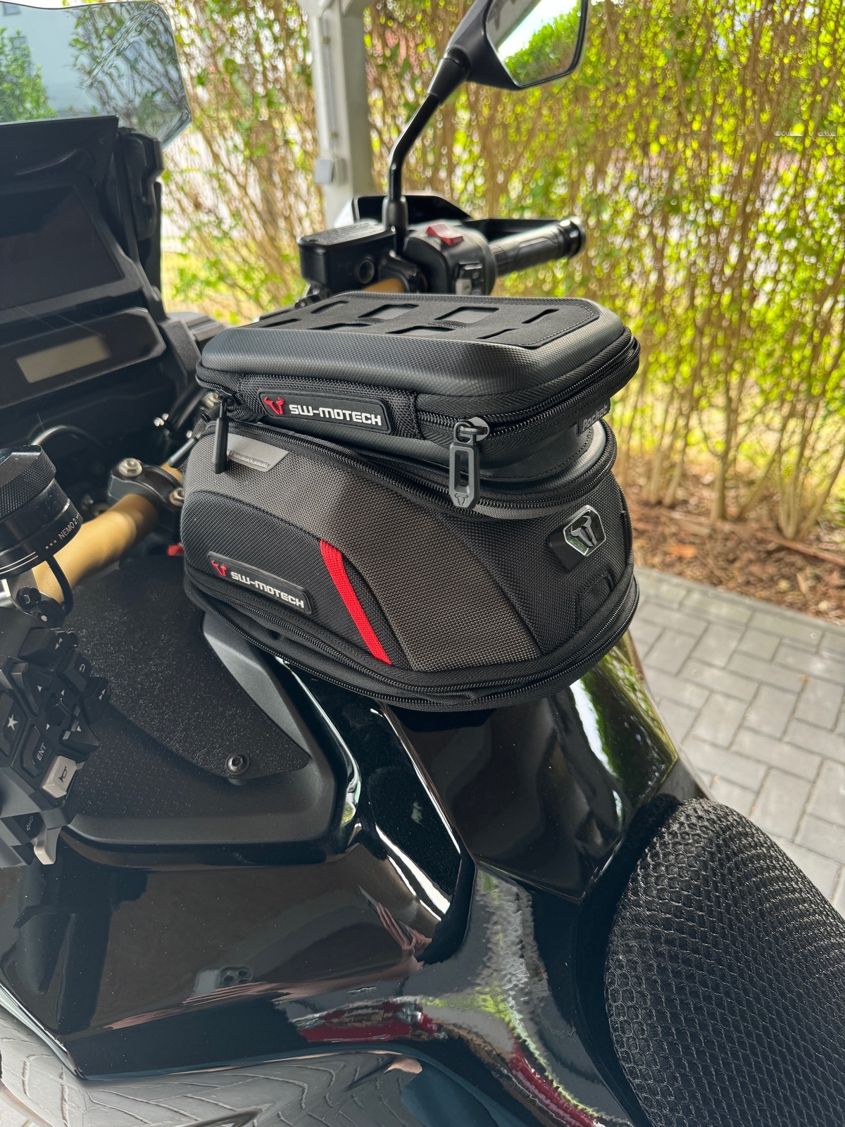 Für die Pro Tankrucksäcke von SW-Motech gibt es seit einiger Zeit eine kleine Tasche (1Liter) als Aufsatz. Wird in die Molle Laschen eingefädelt.