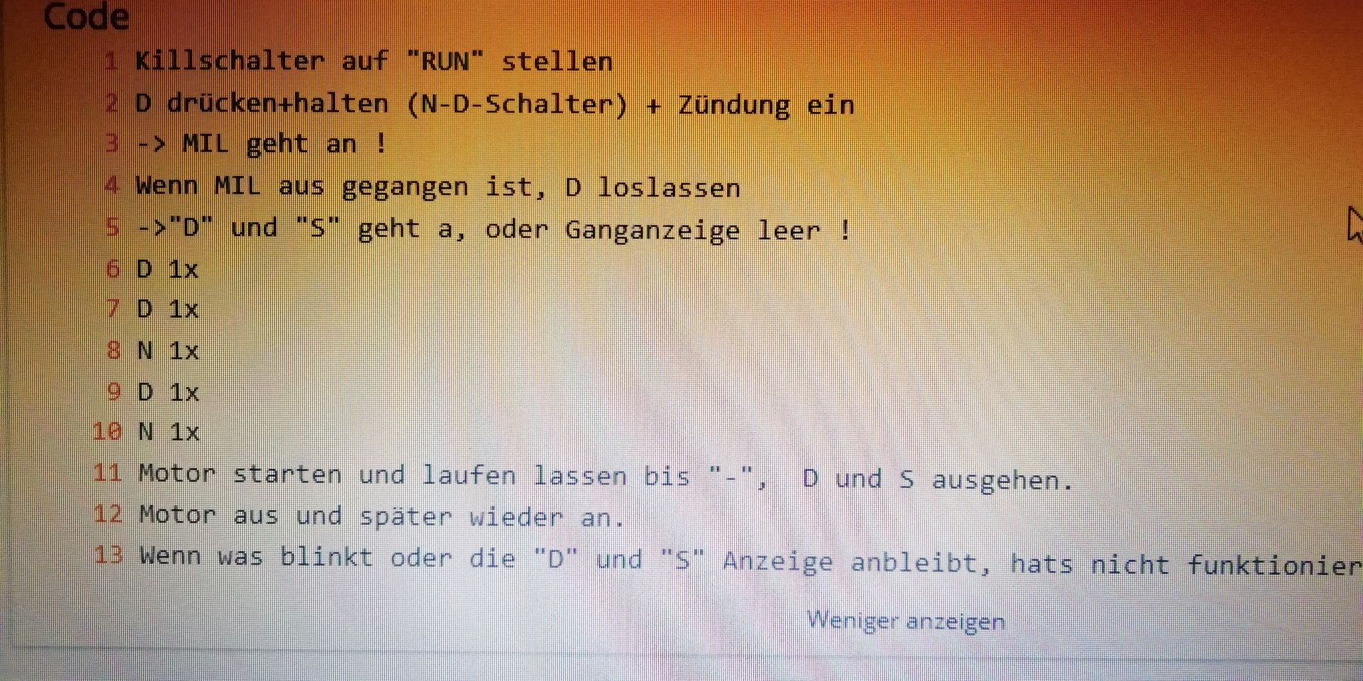 Dann Motor starten und laufen lassen (kein Gas geben!) bis die Anzeige "-", "D" und "S" ausgehen.