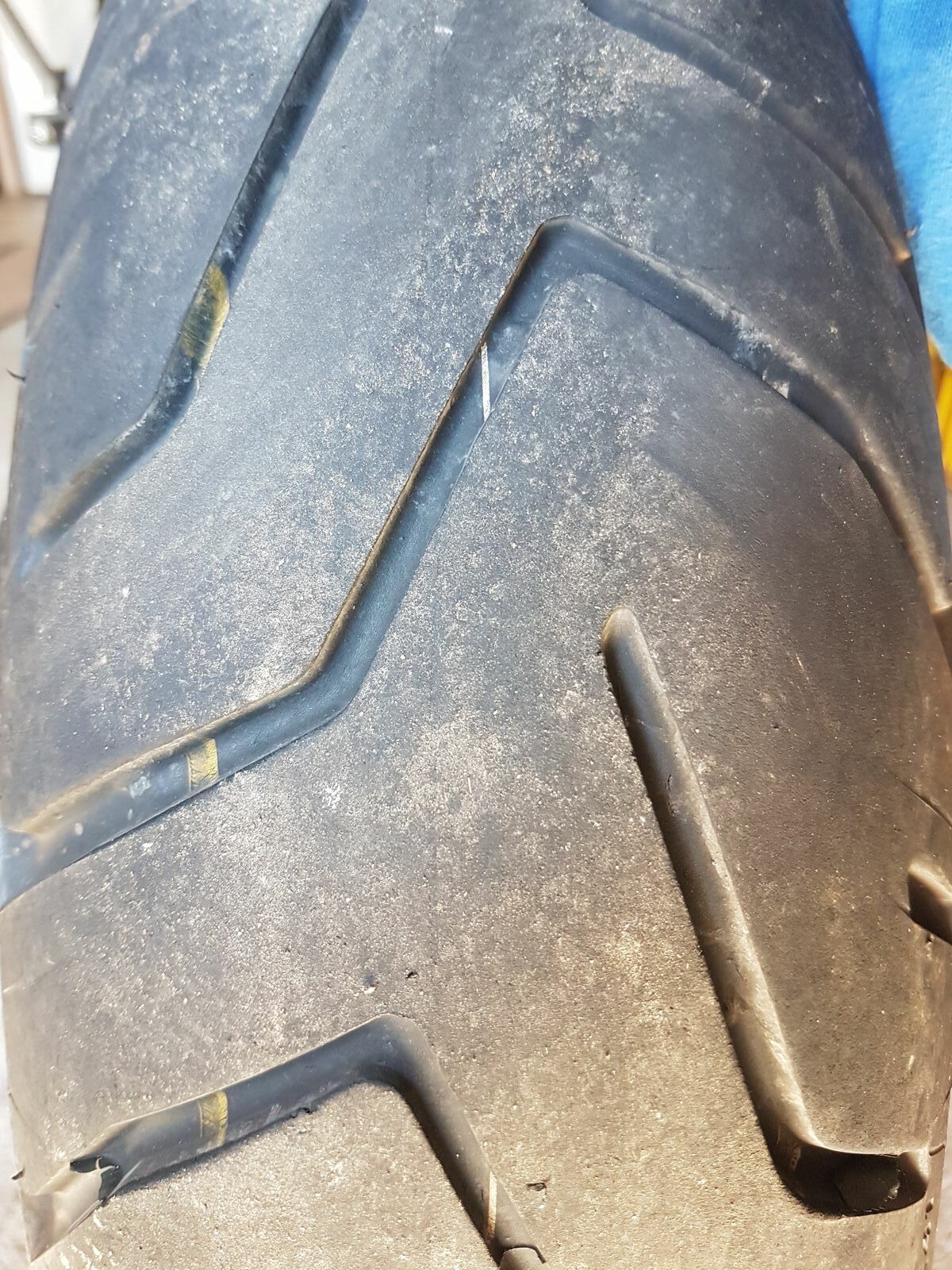 Die Reifen-Restdicke ist dann richtig richtig gering. Du musst damit rechnen daß der Reifen (falls schlauchlos) sogar im Stand platt geht wenn er so aussieht. Wer nur einen Seitenständer hat muss damit rechnen daß die Maschine umfällt wenn ein Reifen platt geht. Das gilt allerdings auch mit einem neuen Reifen.