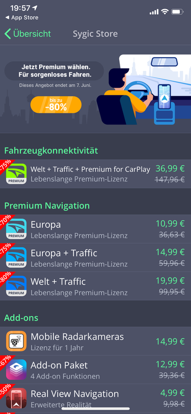Nur so am Rande, ich habe für die Vollversion von Sygic seinerseits 59,95€ gezahlt! Für die ein-oder andere App-Erweiterung ebenfalls nochmal zusammen rund 50,00€. Dafür habe ich lebenslange Kartenupdates und auch die App wird ständig verbessert. Und immer mal kommt etwas Neues dazu, was man dann kaufen kann. Aber das hält sich in Grenzen. Calimoto gefällt mir im Übrigen sehr gut, wobei ich mal wieder die Preispolitik nicht verstehe. Laut Internet kann man eine Vollversion kaufen und das einmalig. Im Apfelladen gibt es das natürlich nicht. Das Jahresabo ist mit 39,95€ auch ok, jedoch hasse ich Abos!!! Man vergisst es einfach zu schnell und hat dann den Salat. Wobei sich das bei mir auf andere Dinge des täglichen Lebens bezieht. Calimoto werde ich mir auch gönnen, jedoch nur das Jahresabo. Die ganze andere Scheiße im Monatsabo finde ich in Summe zu teuer. Und feste Blitzer sind im Sygic zB. mit integriert. Warum sollte ich dafür extra zahlen. Zumal es auch mittlerweile verboten ist solche Apps zu nutzen😉. Und bitte nicht damit anfangen wie klein doch das Unternehmen mit 17 armen Mitarbeitern ist! Bei über einer Million User und mehr, kommt bei denen auch anständig was rum! Und angefangen haben sie alle so! Siehe Apple🤙🏻✌🏻.