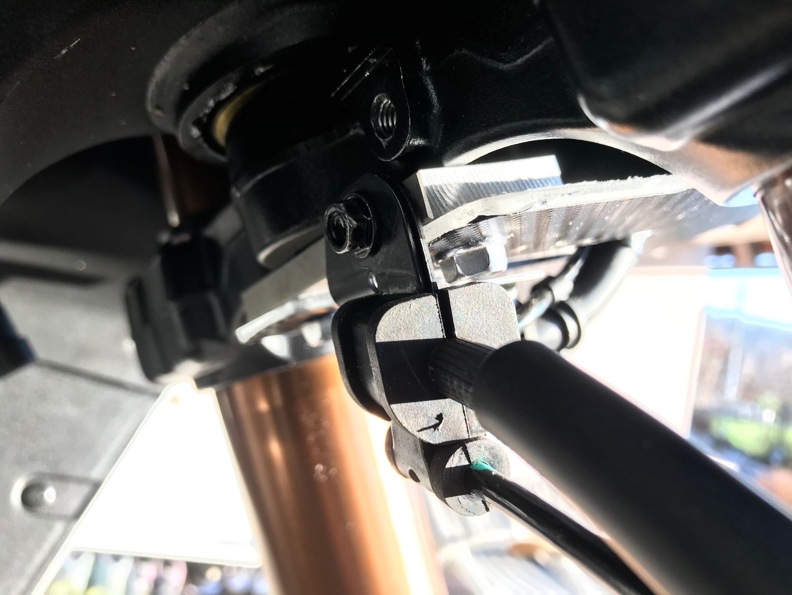 Für die die Befestigung musste ich mir was überlegen: Die untere Gabelbrücke verfügt nur über ein M6 Gewinde, welches den Bremsschlauch und das ABS-Signalkabel hält. Beides ist eigentlich im Weg für meine Lösung. Bedingung war: alles problemlos wieder in Originalzustand versetzen zu können, wenn notwendig. Ich habe nicht die einfachste Variante gewählt. Es macht mir Spass, solche Sachen zu bauen und schützt evtl. vor Chinakopien 8o