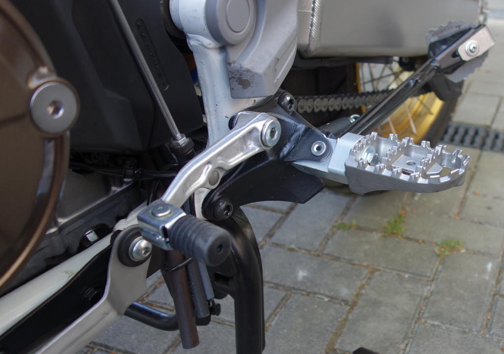 Was mir aber nicht so gefällt ist, dass die Fussrasten um ca 15mm weiter herausragen, Damit wird das Aufsetzen der Fussrasten in Schräglage doch wahrscheinlicher.