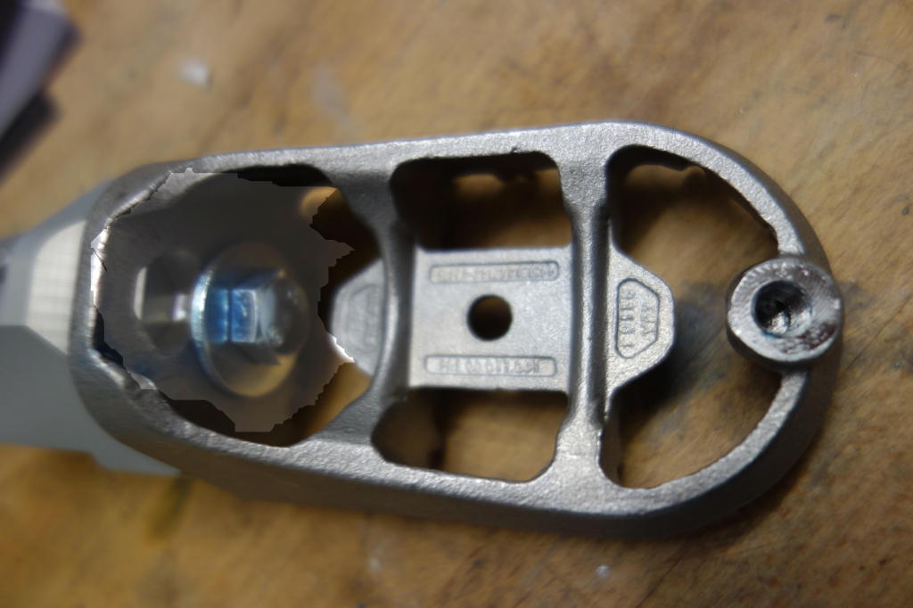Zusamengeschraubte Fussraste von unten betrachtet. Links neben der Schraube ist die 2 Öffnung für die normal hohe Position zu sehen.