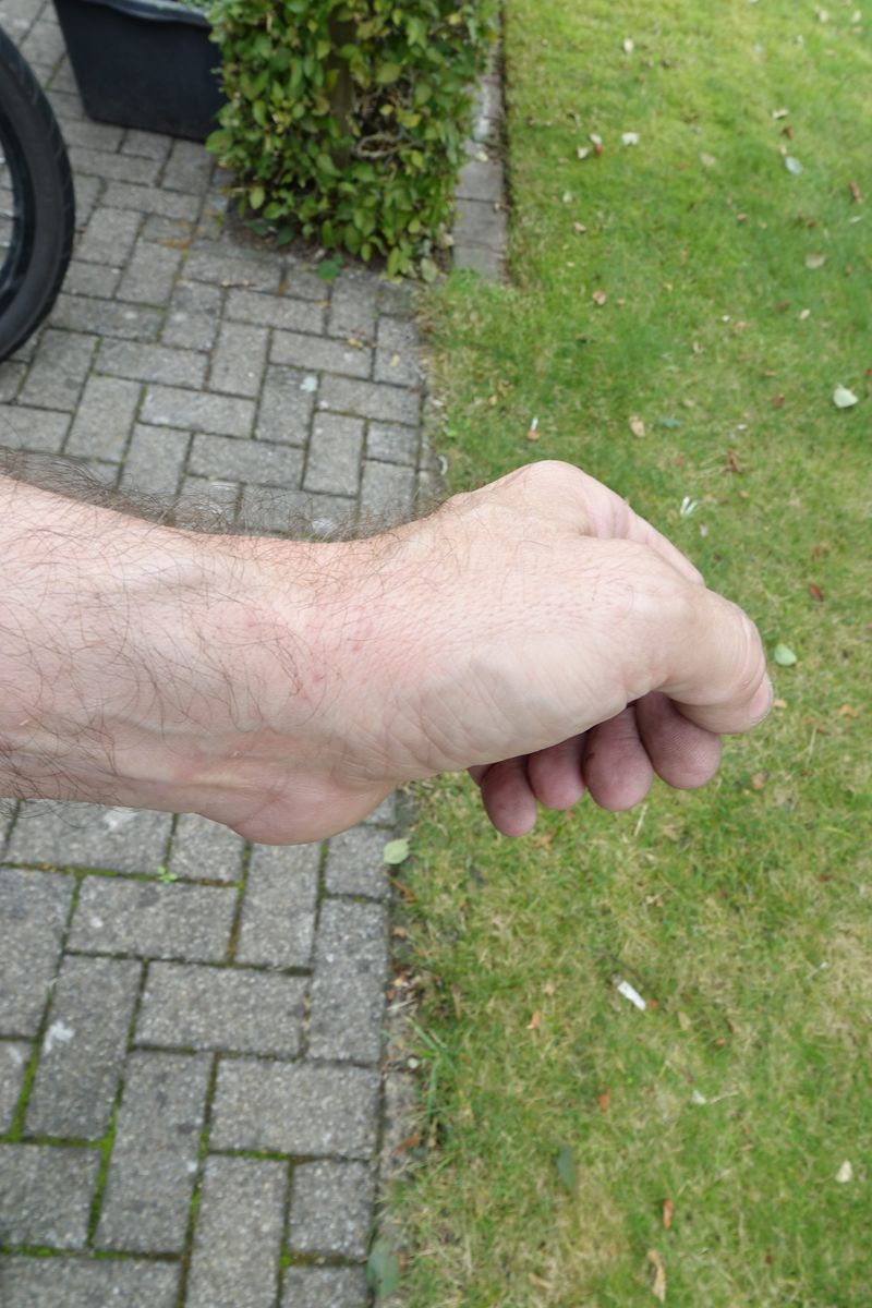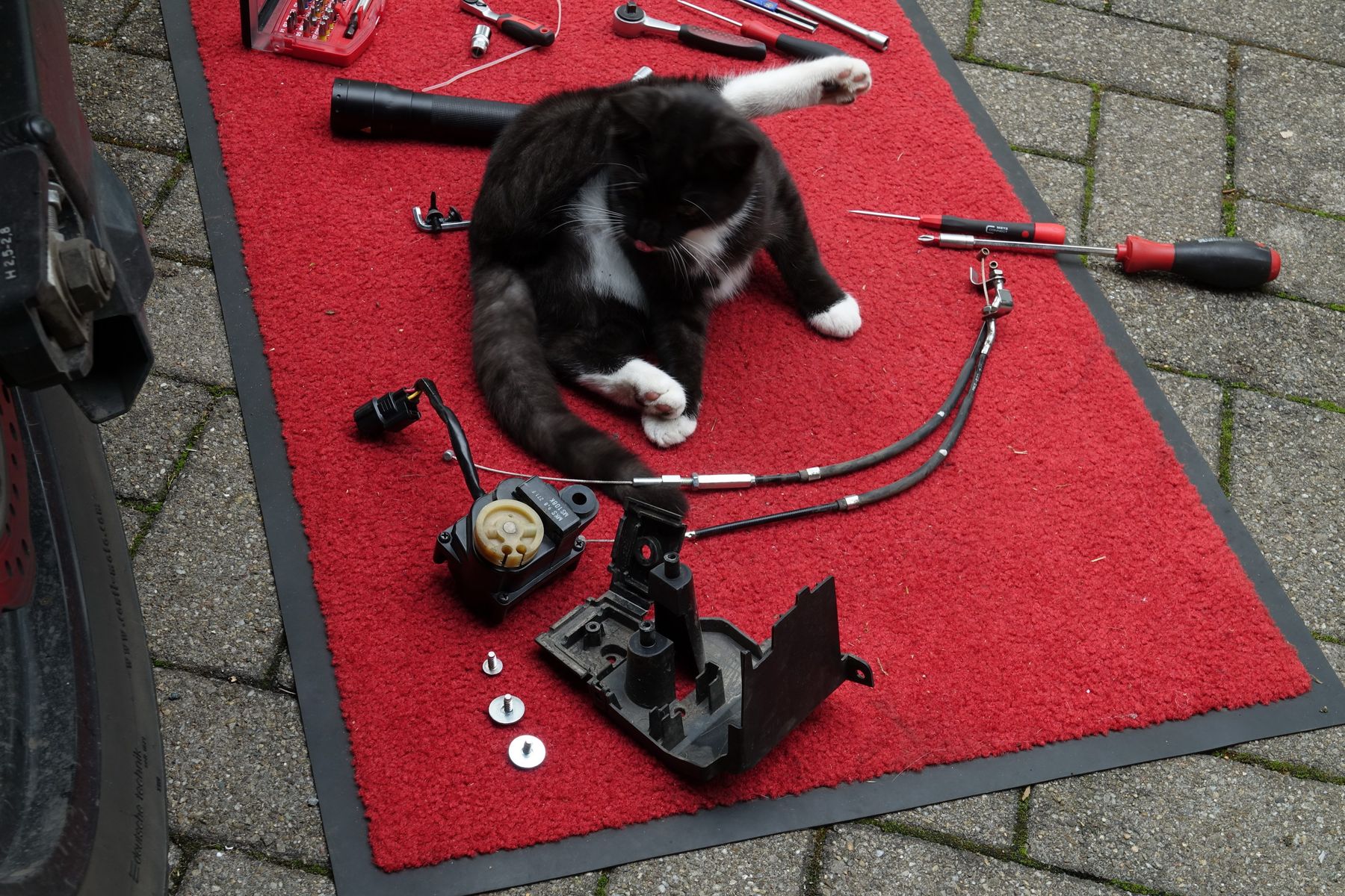 Als ich dann soweit war kam die Katze des Nachbarn und hielt den roten Teppich für ihr neues Reich. Und die Utensilien auf ihrem Teppich hielt sie für ihr erobertes Eigentum. Als ich ihre zwei Stellzüge nehmen wollte hat sie mich gebissen. Also die Katze ist ganz lieb, aber wegnehmen darf man ihr nichts.