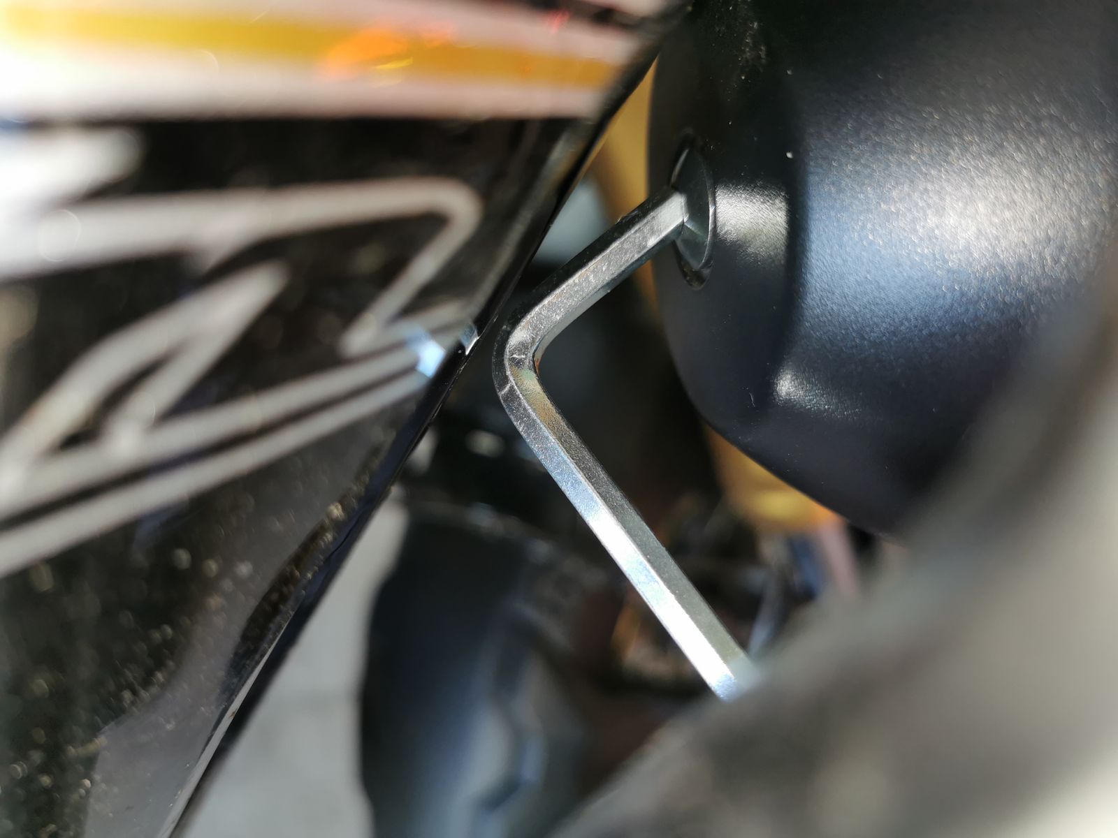 Hat im Prinzip geholfen. Ich konnte die Frontabdeckung entfernen und an die beiden Schrauben rechts und links lockern. Um an die dritte Schraube zu kommen (so wie ich das verstehe) muss ich auch den hinteren Deckel (rund) entfernen. Leider ist der Abstand der Schraube am hinteren Deckel zur Motorradverkleidung sehr gering, sodass ich mit dem normalen Imbusschlüssel da nicht reinkomme.