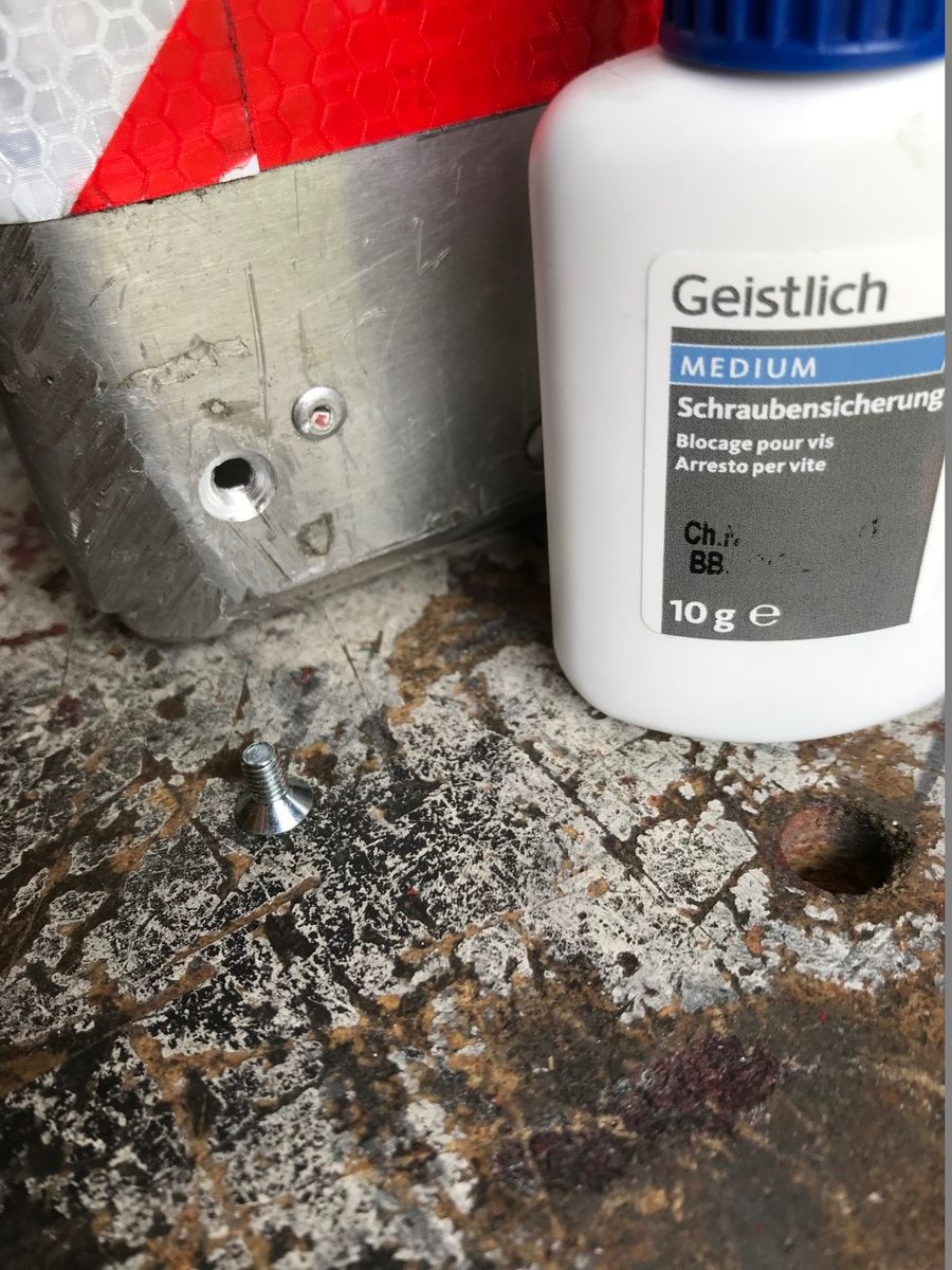 Die acht(!) M5 Gewindelöcher in den Ecken, wo mal so Kunsststoffschütze dran waren, habe ich versenkt und mit M5 Senkschrauben und Schraubensicherung zugeknallt. Innen eine Mutter drauf. Natürlich bevor das Dichtband drauf kam: