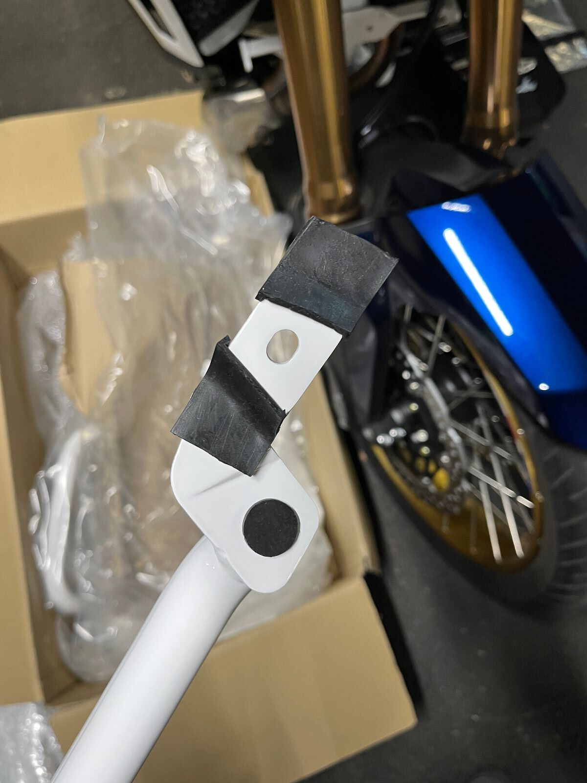 Zusätzlich ist die Linke Seite um ca 1cm "kürzer" als die Rechte und schließt auch nicht so sauber mit der Rundung des Rohrs ab.... Also Rechts kommt der Bogen um ca 1cm näher Richtung Fahrer. Bin mir noch nicht sicher ob ich das reklamieren soll, fest ist auf jeden Fall alles und ich habe ca ne Stunde mit der Anpassung und Korrektur verbracht.Was mir noch aufgefallen ist, anscheinend gibt es jetzt an den Stellen wo es vereinzelt zu Sturzschäden am Rahmen gekommen ist ein kleine Anpassung, es wurden jetzt Gummiteile angeklebt (keine Ahnung ob das schon immer so war, darum ein Foto zum vergleichen).