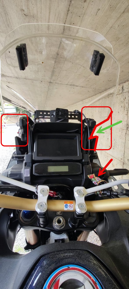Dagegen habe ich eher den Eindruck, die Turbulenzen am Helm werden verursacht durch den Spalt zwischen dem Verkleidungsende und dem unteren , seitlichen Rand des Windschildes (grüner Pfeil). Da kommt ein kräftiger Luftstrahl rein, tifft meine Schultern und meiner Meinung nach auch die Seiten des Helmes.