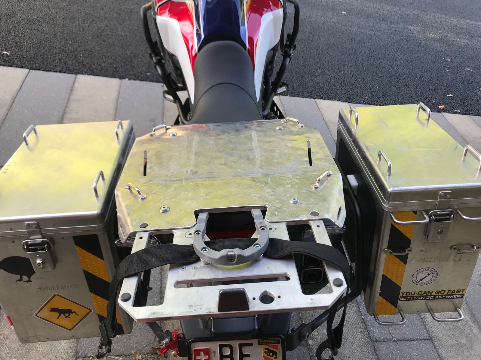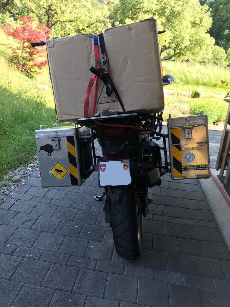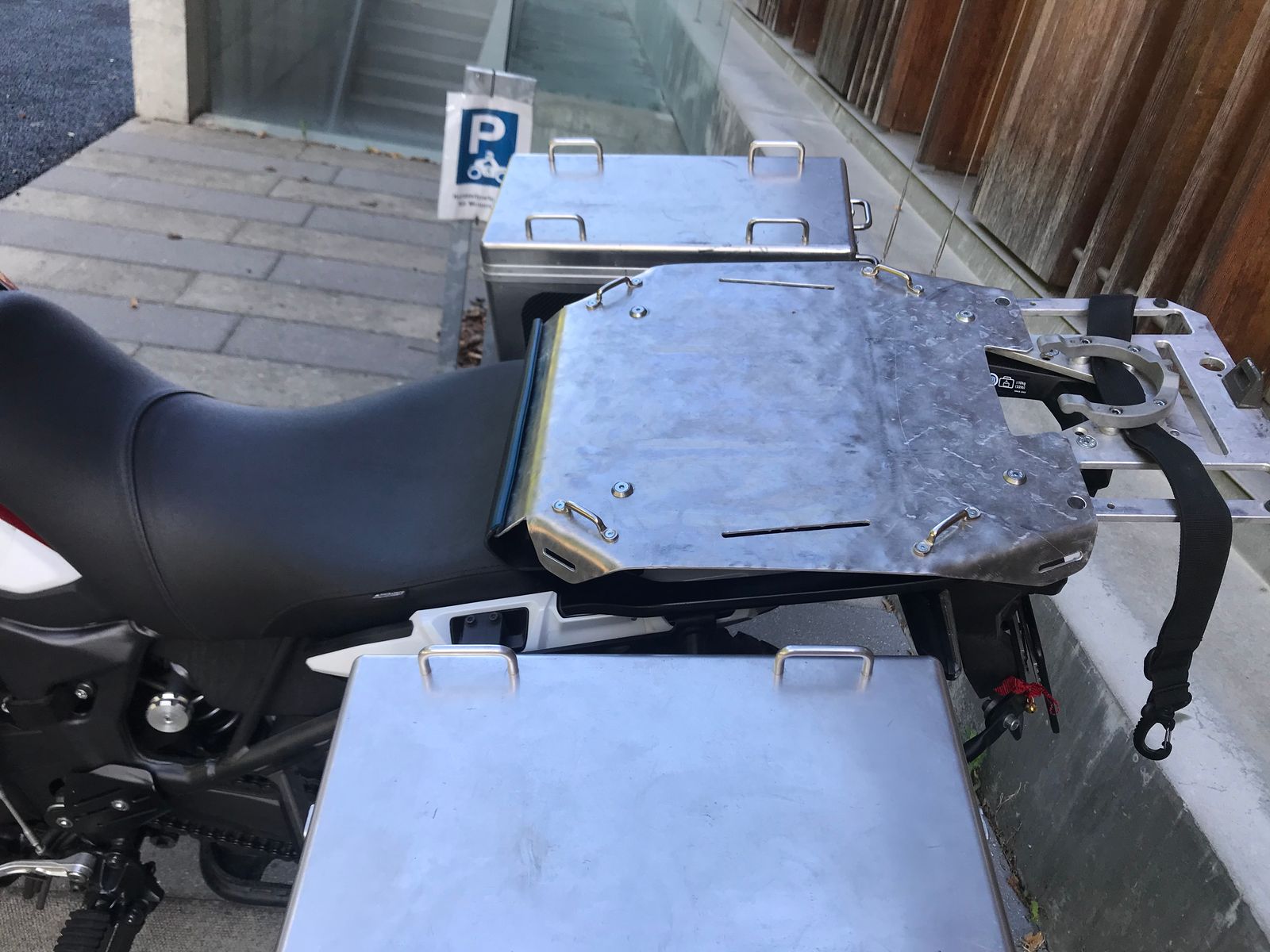 Die angebotenen Platten anstelle des Soziasitzplatzes haben mir nicht zugesagt. Zu schmal, zu tief, zu schwach.. so habe ich eben selber etwas aus 2,5mm Riffelblech gebaut. Die Heckplatte wie die Alu-Verlängerungsplatte sind Eigenbauten. Die Verlängerungsplatte, an welcher vier rostfreie Befestigungsbügel geschraubt und zusätzlich Schlitze gefräst sind, verläuft gerade zur Heckplatte weiter. Unter der Verlängerungsplatte ist eine Kunststoffabdeckung fixiert, damit kein Wasser ins Heck läuft. Diese Abdeckung schliesst auch die Platte gegen vorne ab. Befestigt wird die Halterung der Verlängerungsplatte an den zwei M8 Rahmenschrauben, die Platte an sich wird dann mit vier M6 verschraubt, 2x an die Querstrebe vorne und 2x an die die Heckplatte, die wiederum mit 4 M8 befestigt ist. An der Heckplatte ist ein Tankring von SW-Motech montiert zur schnellen demontage der Hecktasche. Diese ist zusätzlich noch mit einem Riemen mit Karabinerhaken gesichert.