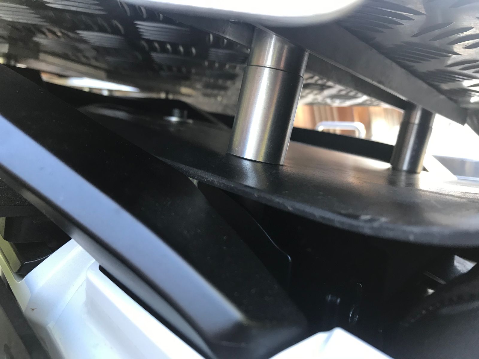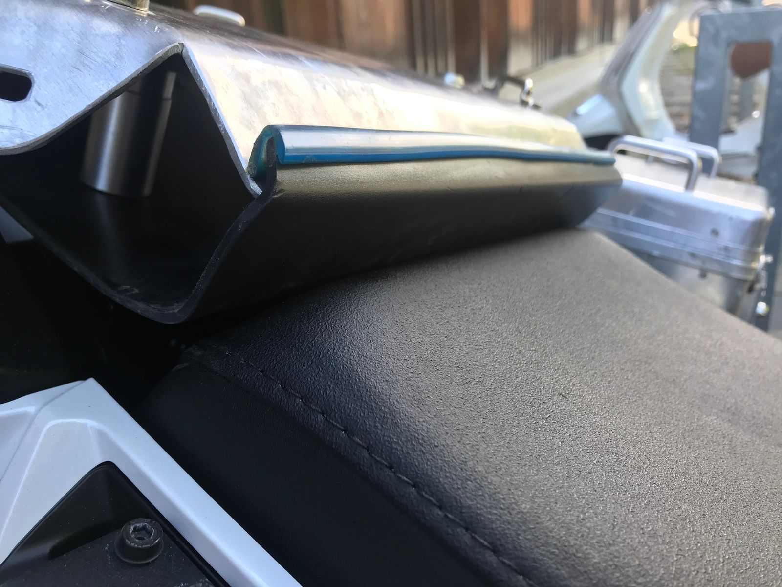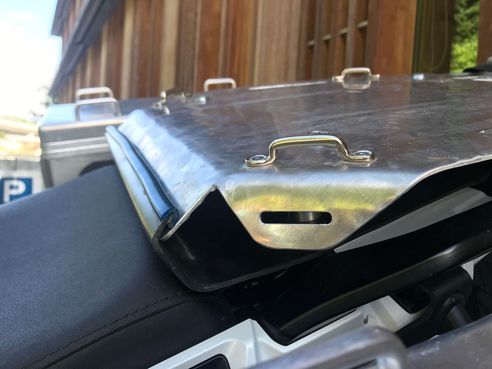 Die angebotenen Platten anstelle des Soziasitzplatzes haben mir nicht zugesagt. Zu schmal, zu tief, zu schwach.. so habe ich eben selber etwas aus 2,5mm Riffelblech gebaut. Die Heckplatte wie die Alu-Verlängerungsplatte sind Eigenbauten. Die Verlängerungsplatte, an welcher vier rostfreie Befestigungsbügel geschraubt und zusätzlich Schlitze gefräst sind, verläuft gerade zur Heckplatte weiter. Unter der Verlängerungsplatte ist eine Kunststoffabdeckung fixiert, damit kein Wasser ins Heck läuft. Diese Abdeckung schliesst auch die Platte gegen vorne ab. Befestigt wird die Halterung der Verlängerungsplatte an den zwei M8 Rahmenschrauben, die Platte an sich wird dann mit vier M6 verschraubt, 2x an die Querstrebe vorne und 2x an die die Heckplatte, die wiederum mit 4 M8 befestigt ist. An der Heckplatte ist ein Tankring von SW-Motech montiert zur schnellen demontage der Hecktasche. Diese ist zusätzlich noch mit einem Riemen mit Karabinerhaken gesichert.
