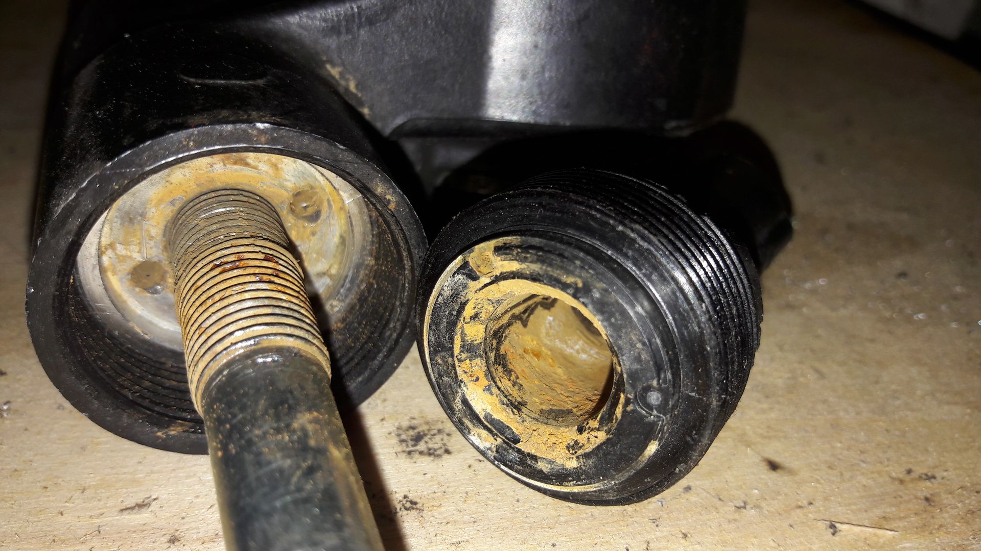 hatte Dir beim Treffen auch von meinem Federbein erzählt, welches durch Rost sich nicht mehr verstellen ließ. In folge dessen, habe ich durch Gewalt die Mechanik im Versteller überdreht. Ich habe mir ein gebrauchtes gekauft und die Schwarze Führungshülse abgeschraubt, mit Fett gefüllt und wieder zusammen gebaut. Hoffe das hilft.
