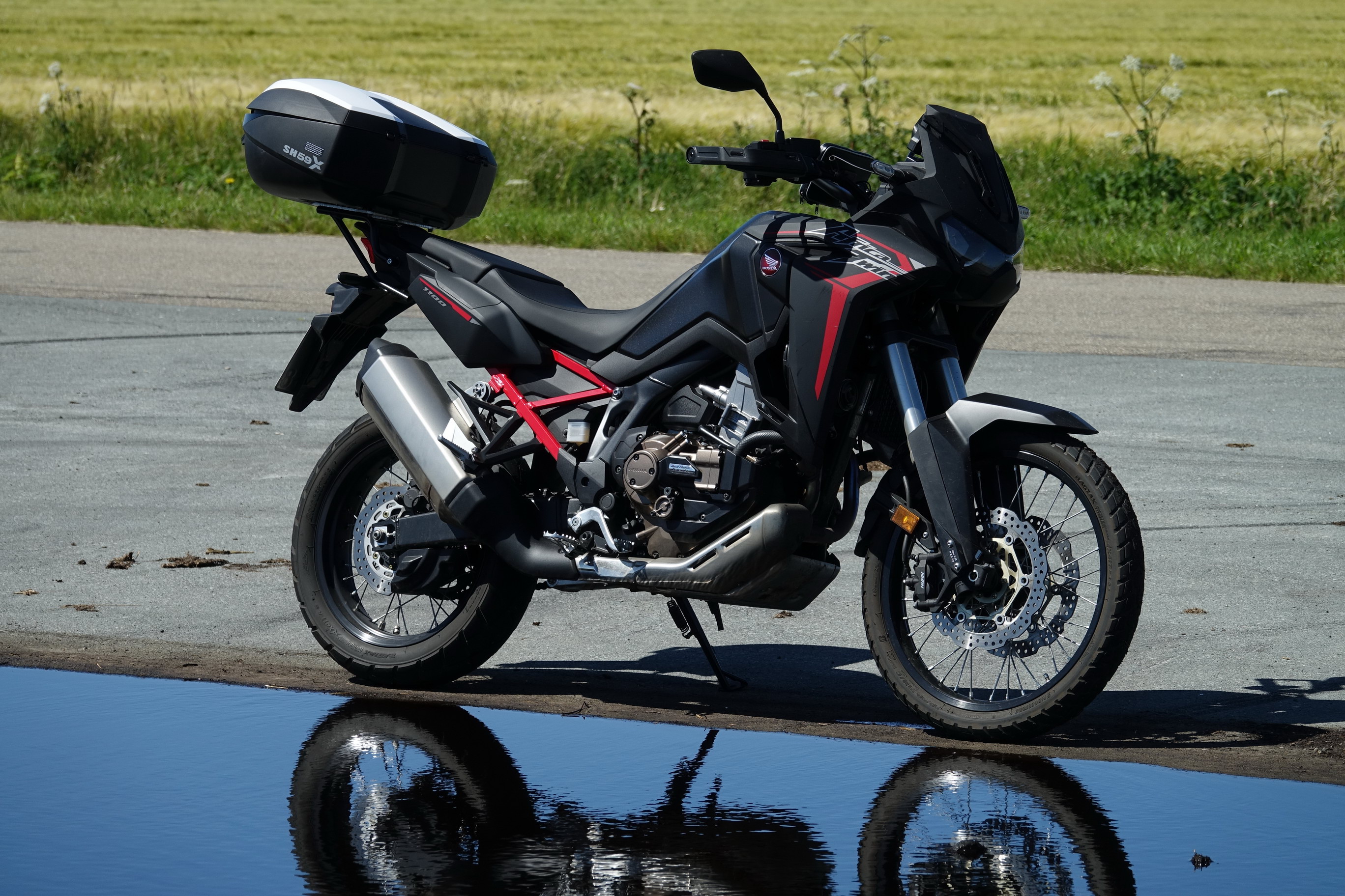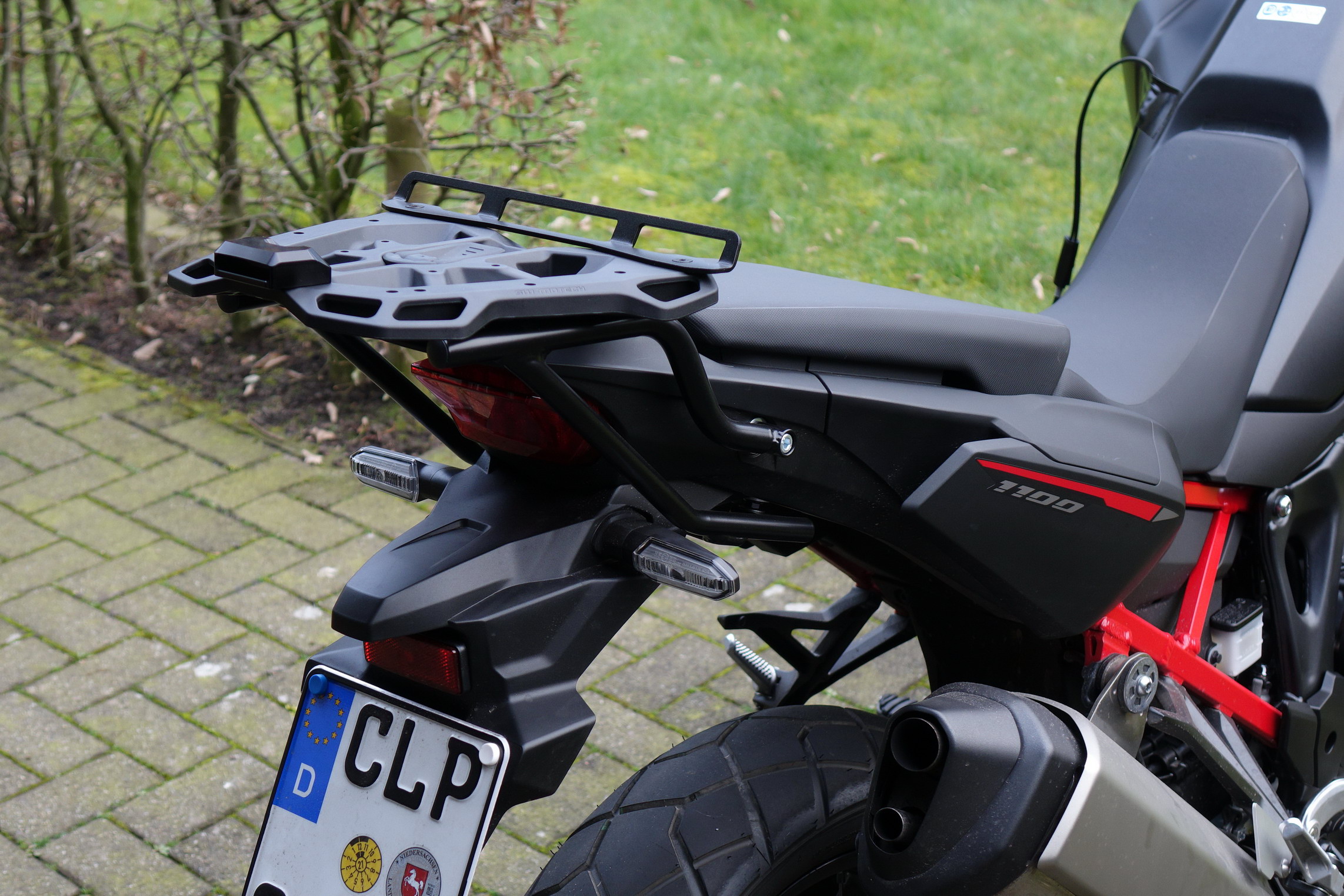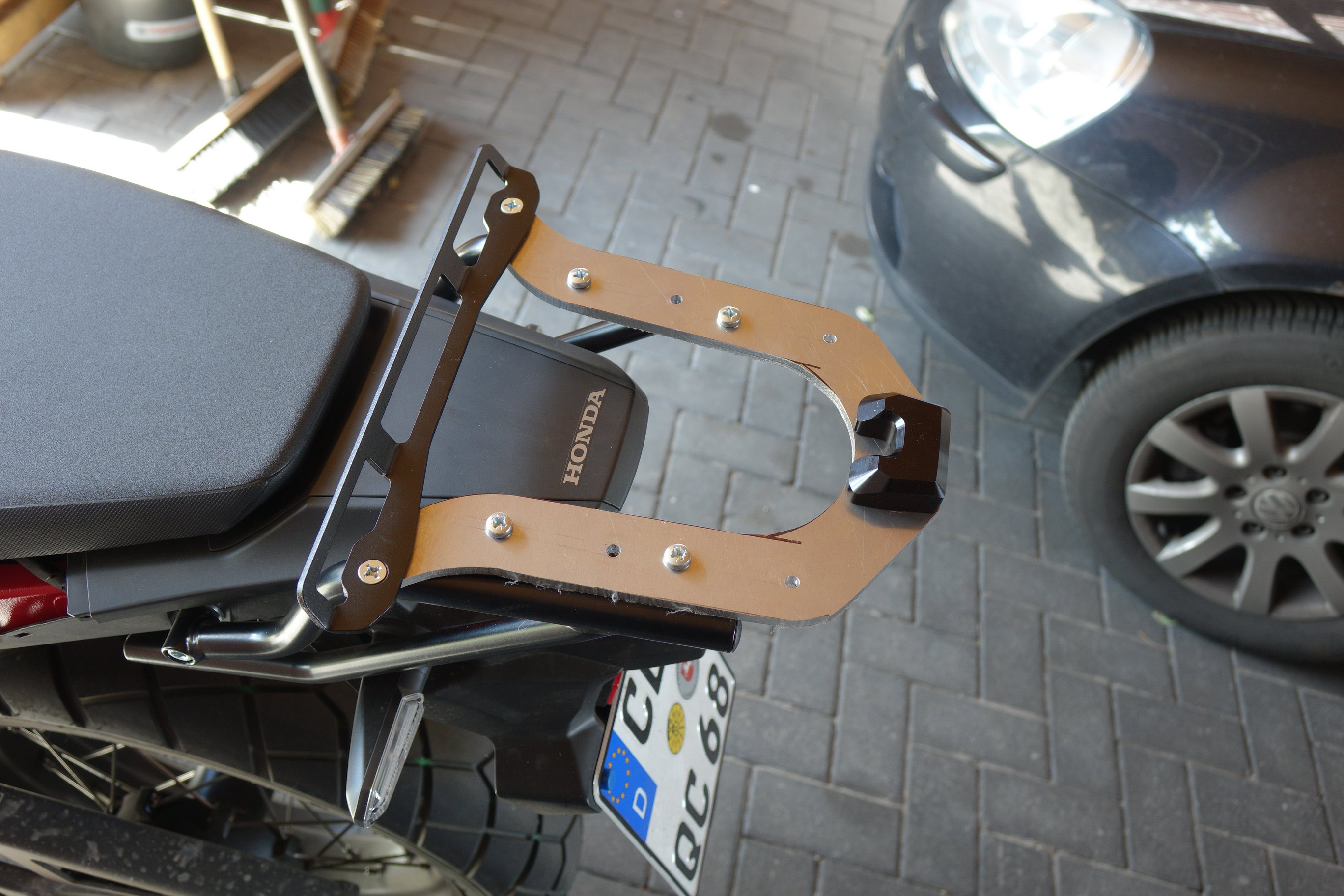hier Fotos von einem zum Teil selbst angefertigtem Topcaseträger. Unten ist der zweiteilige Träger von H&B. Es war sehr schwierig den gerade zu montieren. Das zeigen die Bilder nicht. Darauf ist eine Kunststoff-Trägerplatte von Motech gelegt (die aber nicht befestigt ist). Um Bauhöhe zu sparen und um auch etwas selbst zu machen habe ich dann die Kunststoff-Trägerplatte durch eine Aluminiumplatte ersetzt. Auf dem Foto ist sie noch nicht ganz fertig. Die Entfernung zum Sozius kann gewählt werden. Ein Foto zeigt dann die Honda mit dem Topcase.