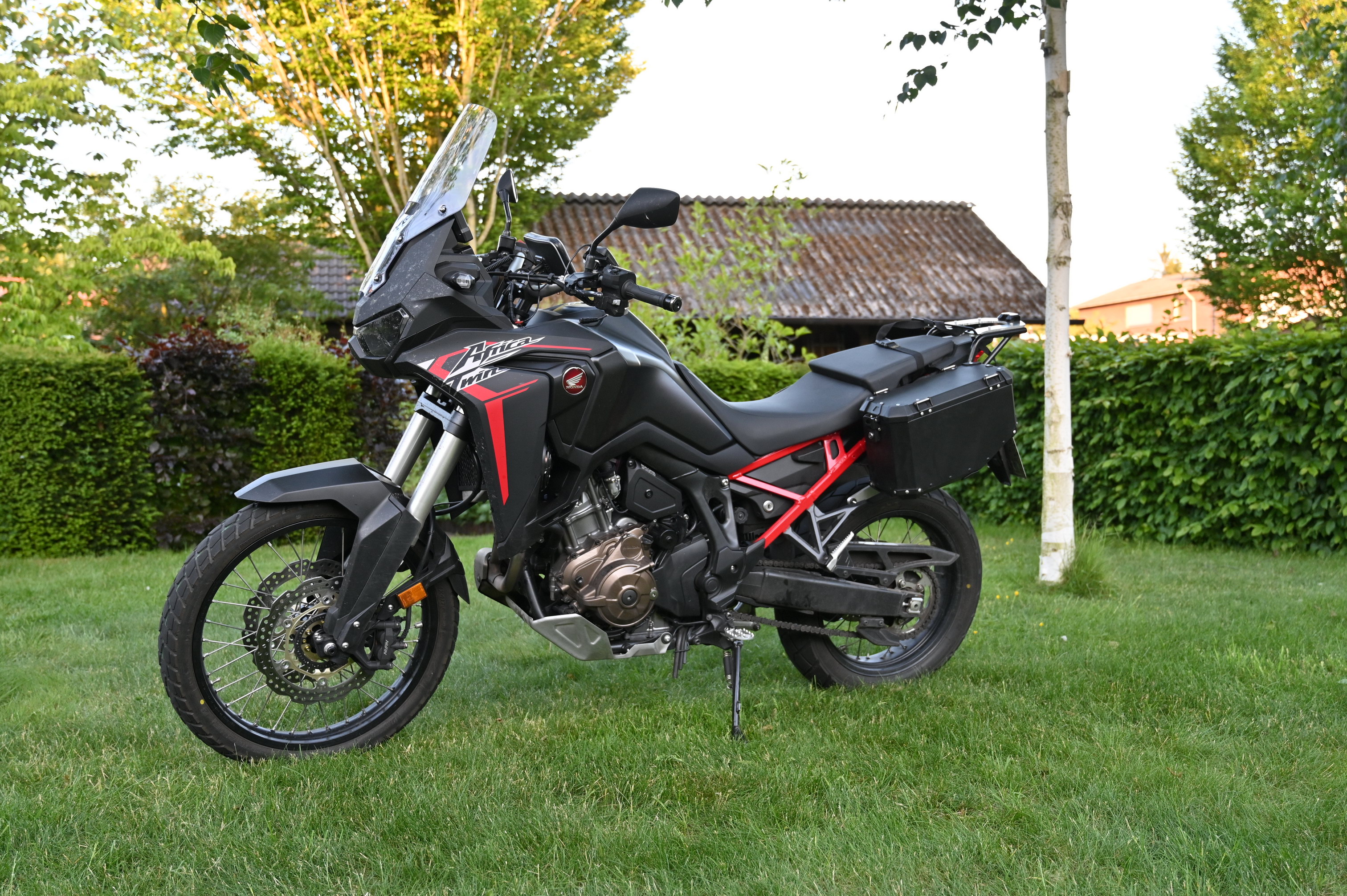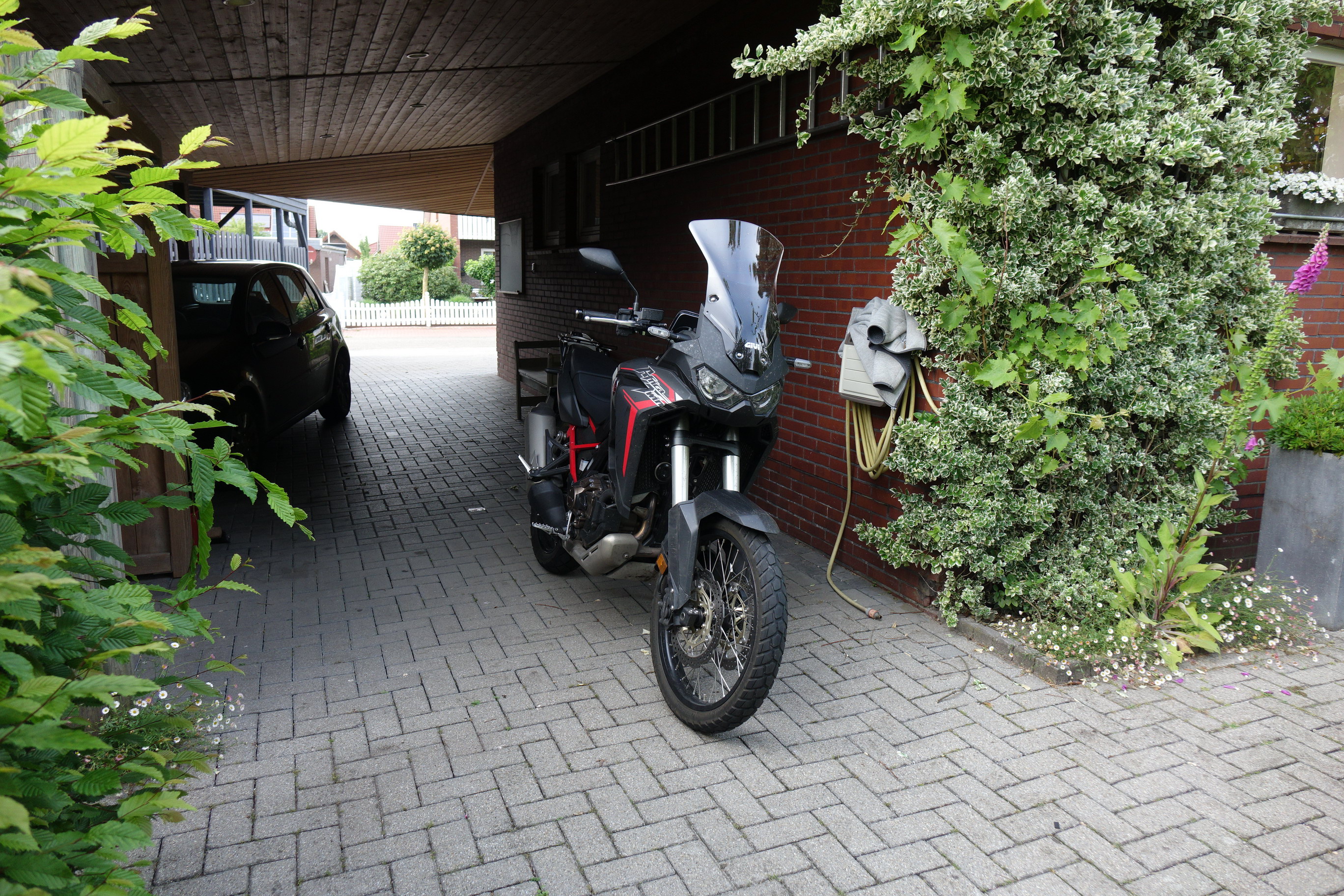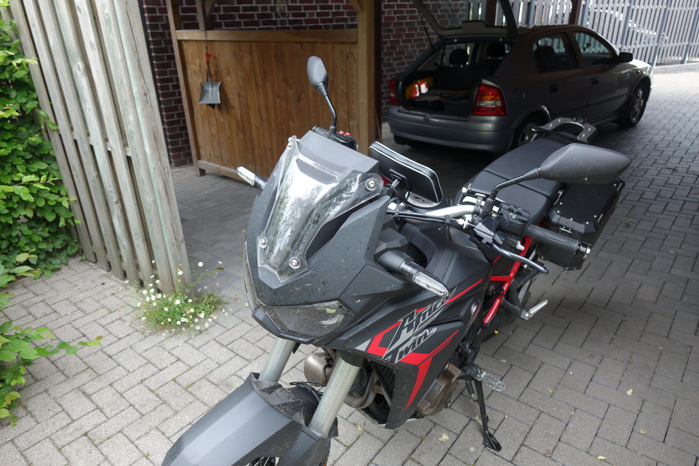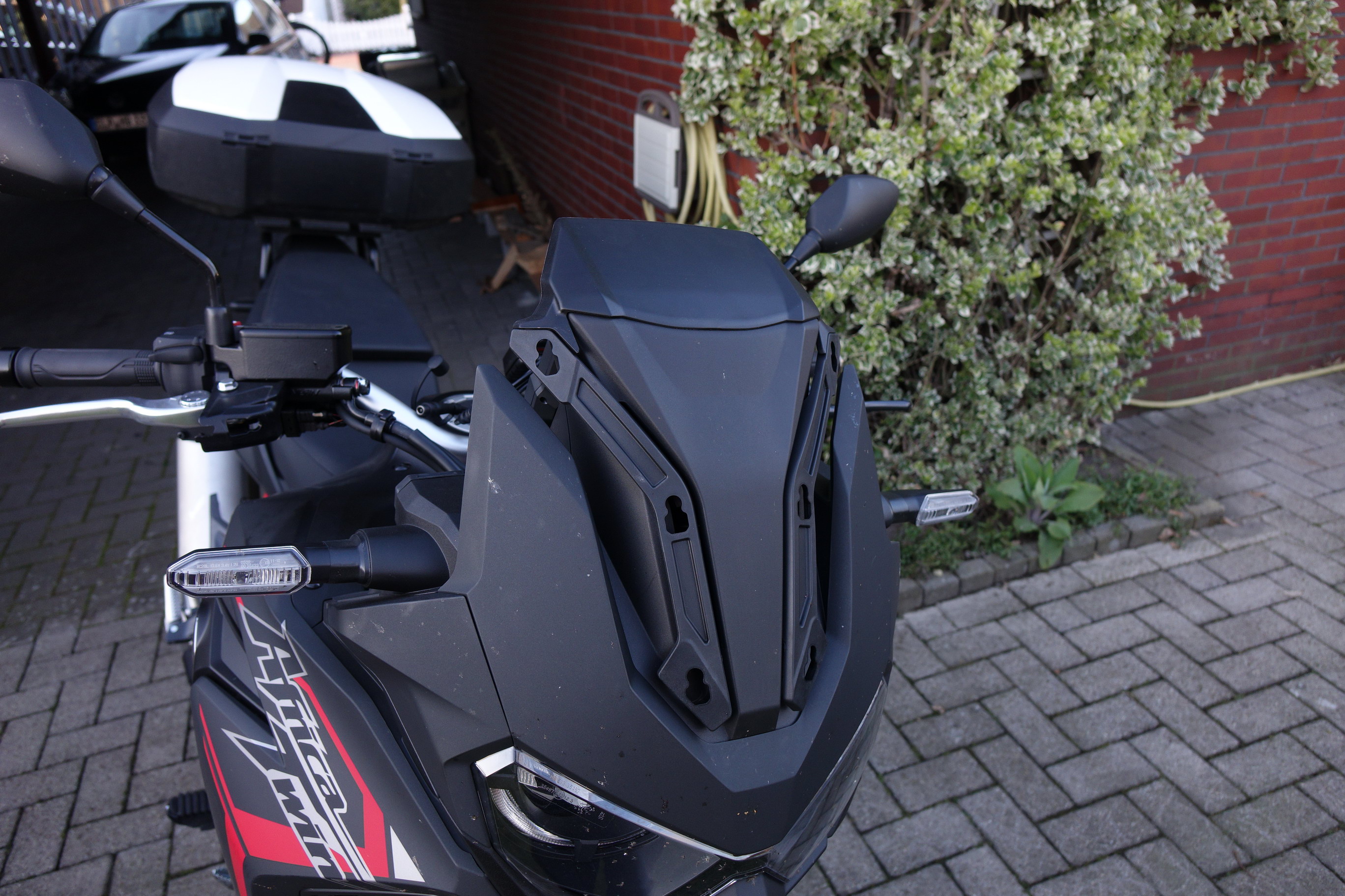 Herausgekommen ist bei mir dann etwas spät die Version ganz ohne Scheibe (ohne Foto) mit hohem Sitz in hoher Position. Dies dann mit dem gelben Helm. Nun spüre ich keinen großen Unterschied zwischen der Anströmung bei stehendem Fahren und sitzendem Fahren. So war ich letzte Woche ohne Probleme mit Fahrspaß 500 km am Stück gefahren, dazu dann noch 100km im Regen.
