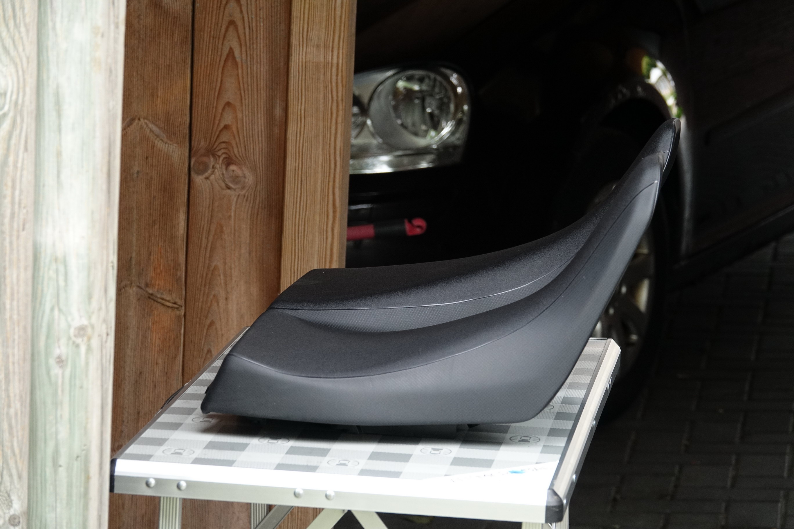 hier Fotos von diversen Experimenten mit Scheiben, Sitzbänken und Helmen. Grund für die Experimente: Unkomfortables Fahren hinter der Scheibe wegen starker Druckschwankungen am und im Helm. Meine subjektiven Erfahrungen möchte ich hier mitteilen.