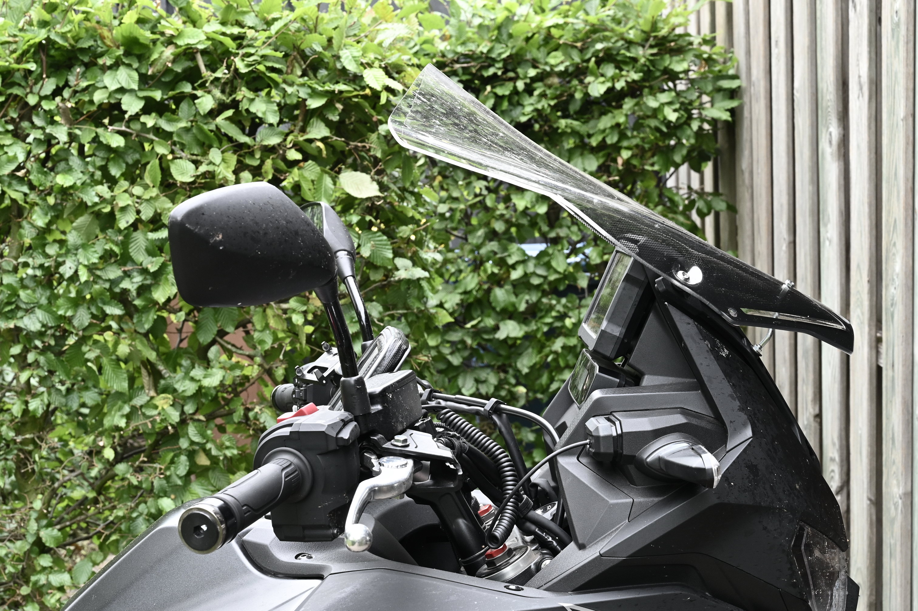 Nicht abgebildet ist die normale Serienscheibe und die große Givischeibe als sie neu war. Abgebildet ist die später zurechtgeschnittene Givi-Scheibe und die später gekürzte Serienscheibe. Es waren insgesamt sieben Versionen an Scheibenhöhe. Die Scheiben habe ich mit drei Sitzhöhen getestet: Seriensitz tief und hoch eingehängt und hoher Sitz hoch eingehängt. Dazu habe ich noch vielfach den Helm gewechselt. Auch der Gabeltunnel war zeitweise mit Schaumstoff zugestopft. Die große Scheibe habe ich zeitweise schräg und ganz schräg montiert. Die mir lästigen Druckschwankungen im und um den Helm habe ich bei verschiedenen Geschwindigkeiten "getestet" und immer wieder mit stehendem Fahren verglichen (Helm in fast unverwirbelter Luftströmung). Das alles mit verschiedenen Jacken.