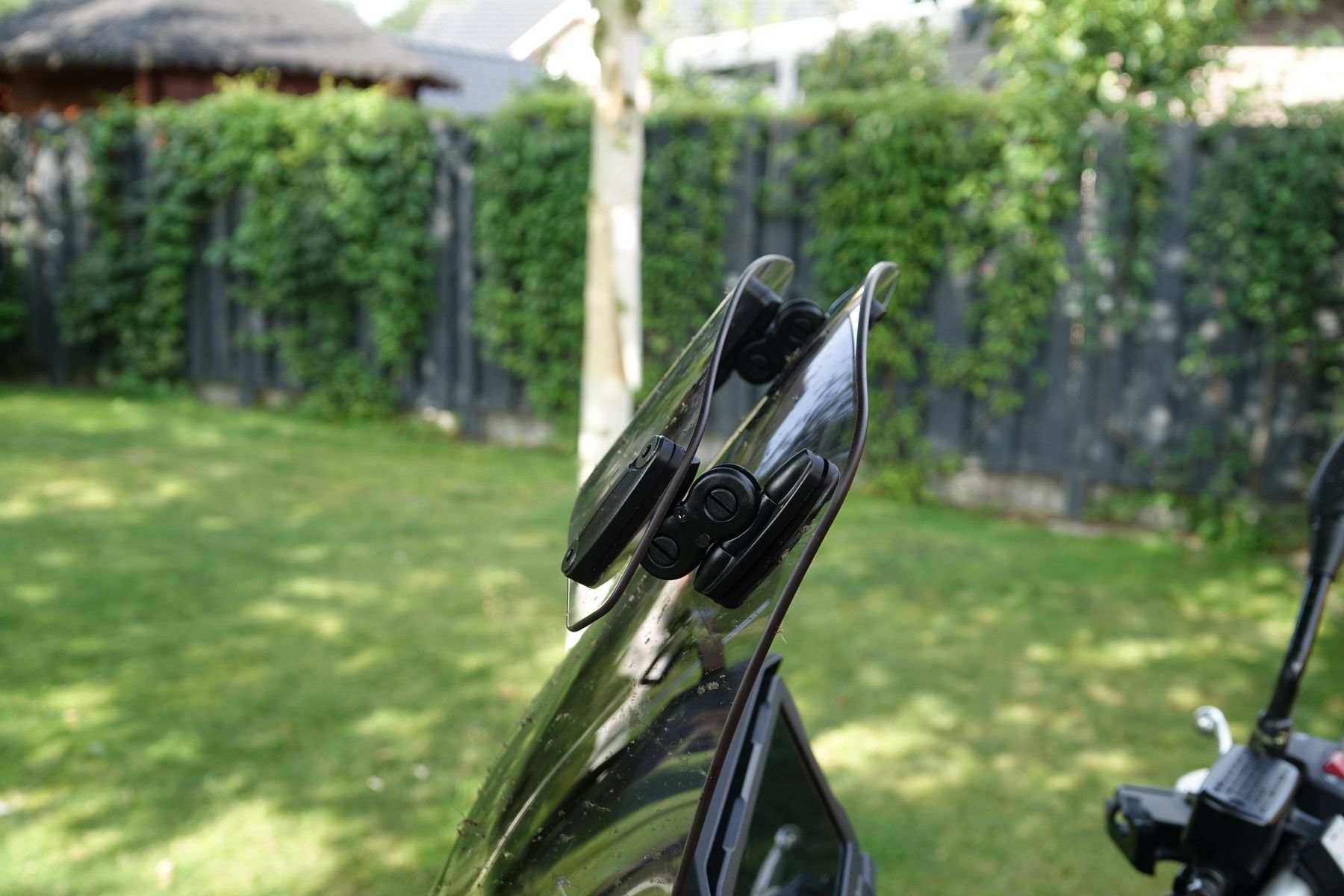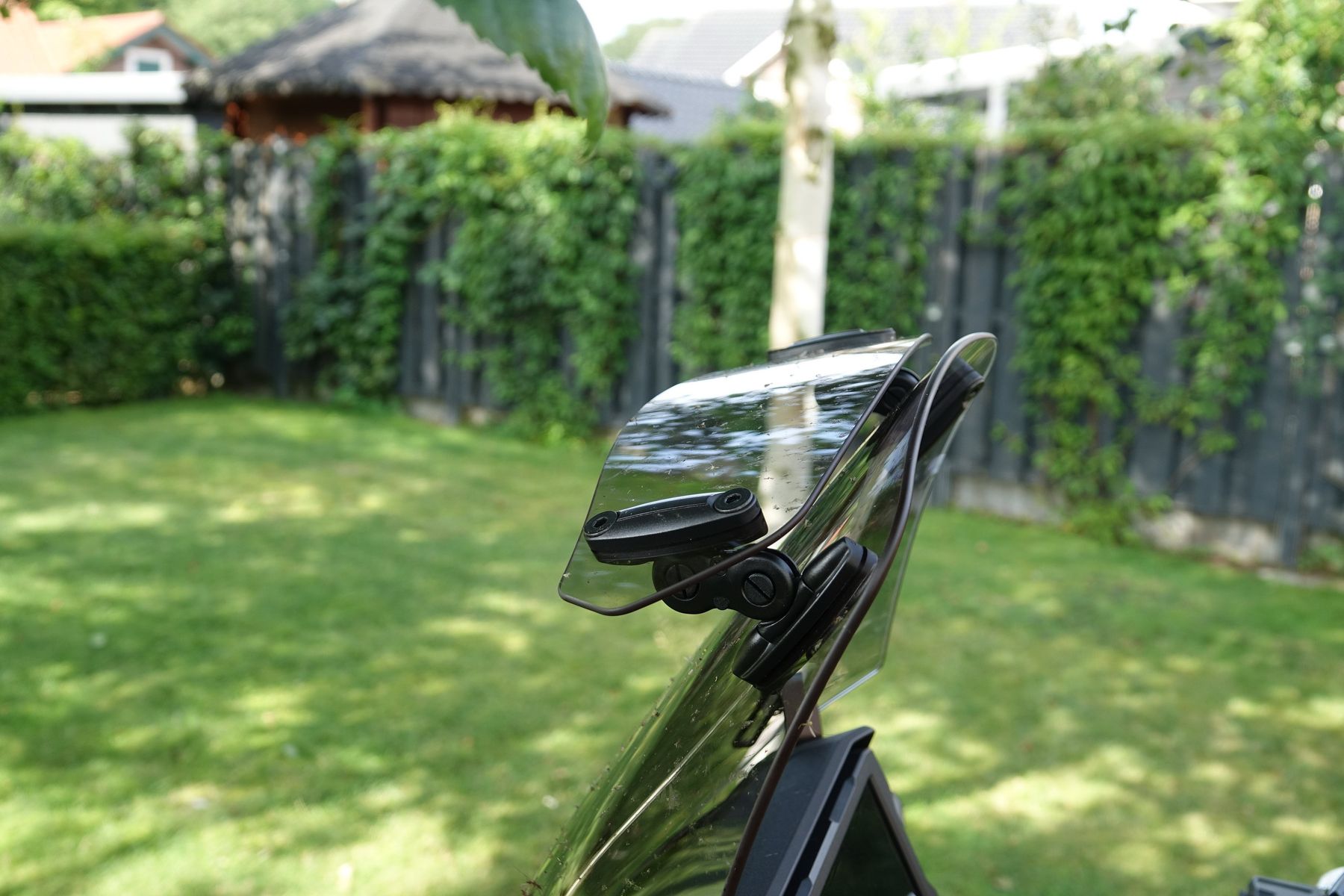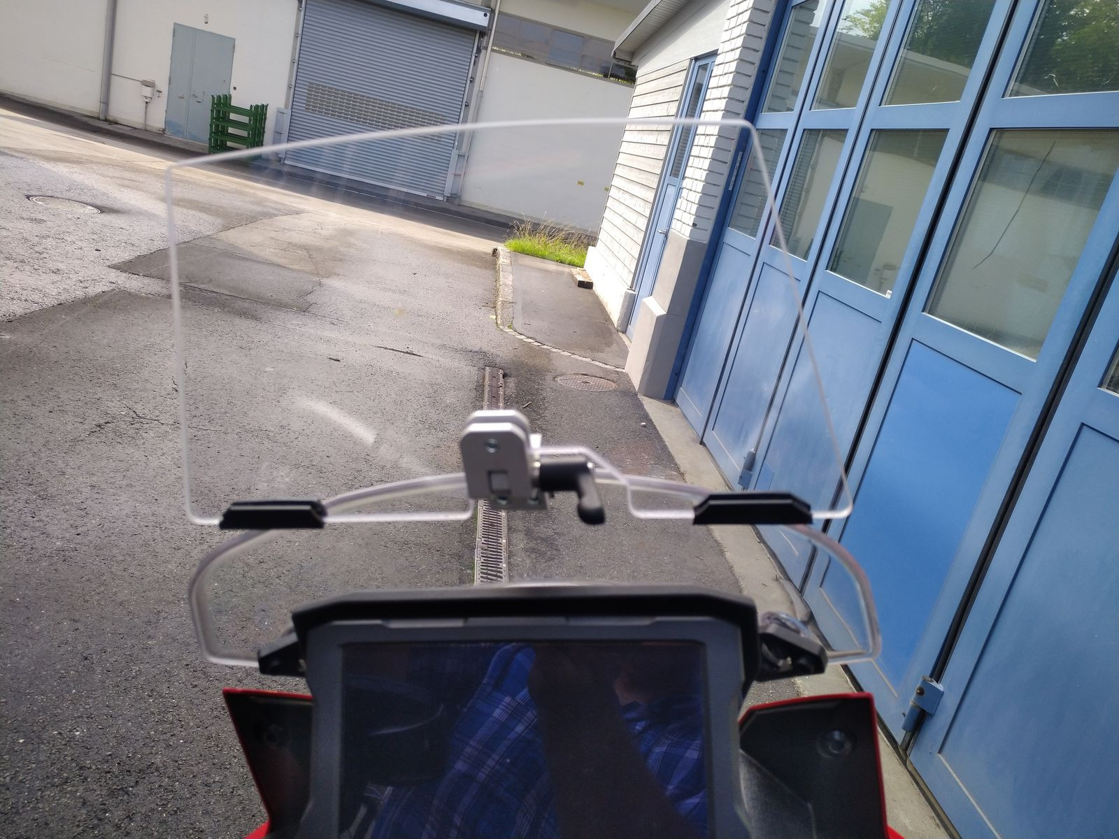 Der Aufsatz stützt sich auf der Originalscheibe ab. Erstaunlich stabil - als müsste es genau so sein. Mit dem Anstellwinkel hab ich während der Fahrt gespielt. In Flucht zur Originalscheibe hat sich am besten bewährt.